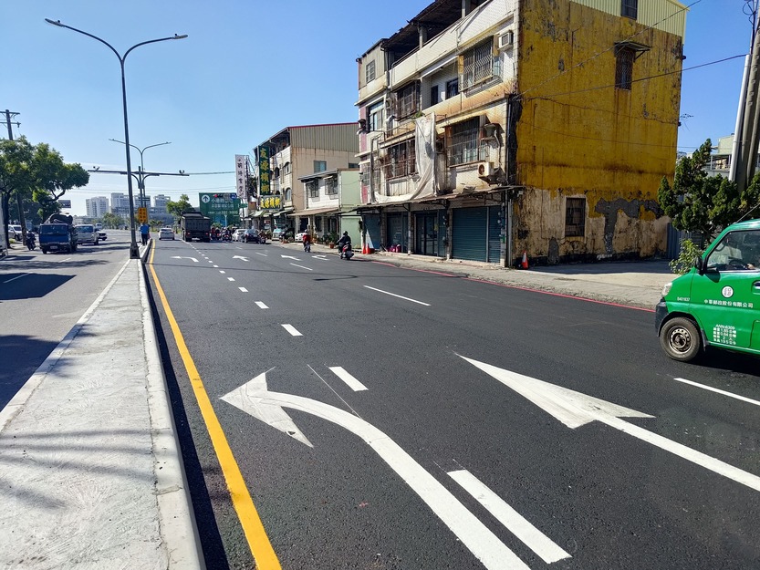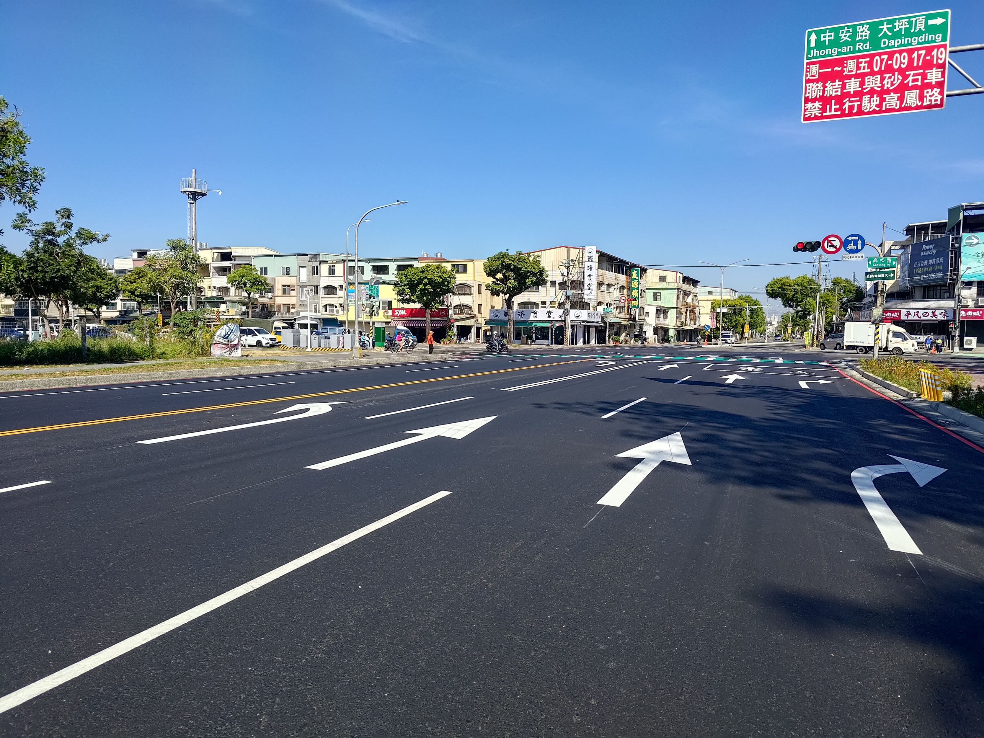 道工處說明,本工程針對高鳳路口約100公尺長路段中央分隔島進行削切縮減寬度後,調整路型增設左轉專用道,亦調整營口路路型設置左轉專用道,並重新刨鋪改善路面,增進車流動線順暢性與行車舒適度。