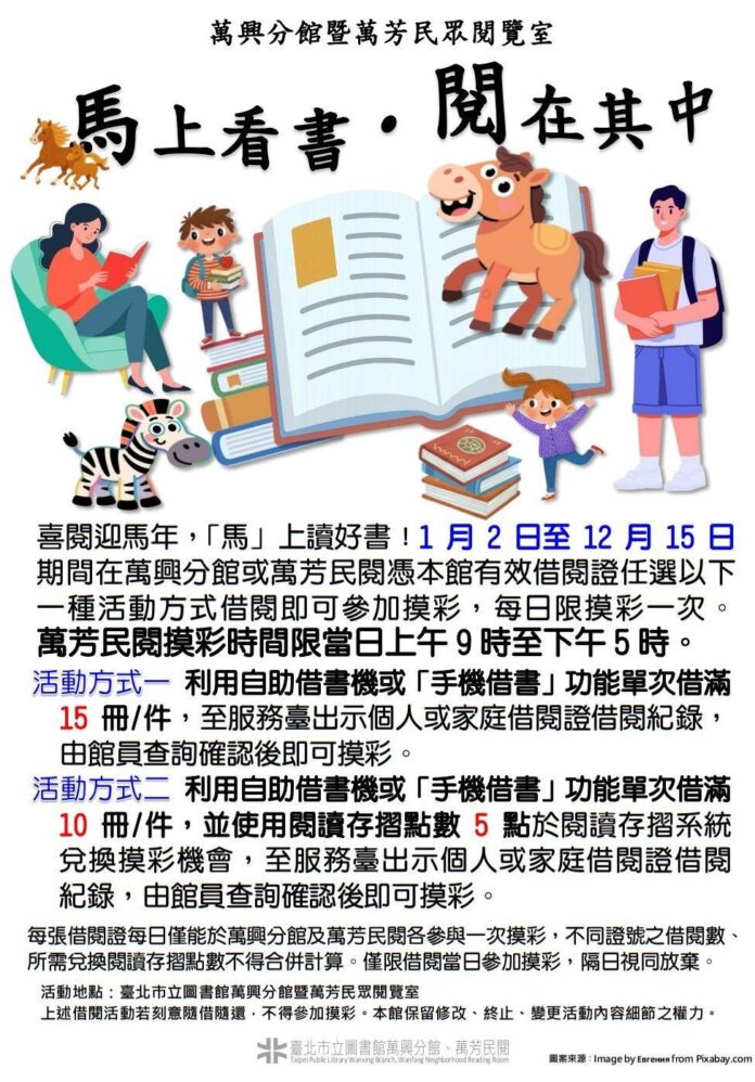 相關活動資訊請至臺北市立圖書館網頁(連結)查詢,或洽詢萬興分館電話:02-22345501。