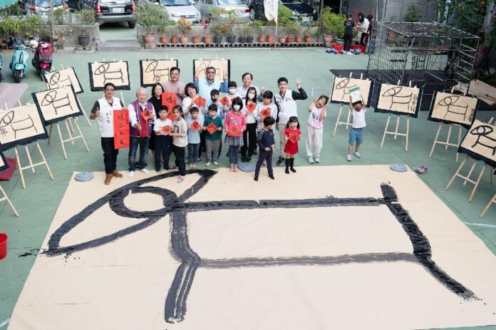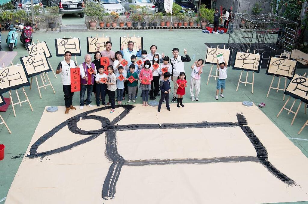春節將至,嘉義社區發展教育事務基金會今(14)日下午在博愛教會第一廣場及二樓書法教室舉行「嘉義市112年度推動跨領域書法教育『畫寫春聯』活動」,以寫春聯帶領孩子們體驗傳統文化之美,帶動學生學習書法風氣,更創意結合畫寫春聯,將語言與藝術領域結合。黃敏惠市長特別出席與孩子們一同揮毫迎新春,並合力創作大型甲骨文「兔」字地景藝術,迎接鴻「兔」大展的一年到來。 市長黃敏惠表示,年節將近,看到孩子們帶領著大人一同體驗書法的樂趣,並將自己在課堂中學習的成果展現出來,是一件很幸福的事。將書法學習結合節慶,不僅讓學習更有趣,發揮創意集體創作以拖把「畫寫」出甲骨文「兔」字,更將美學與生活巧妙連結,期待充實而快樂的學習過程在孩子心中埋下在美學種子,並在日後成長茁壯。黃市長也感謝社區基金會推動社區教育不遺餘力,從兒童哲學、寫生到這學期的書法教育,都看見了豐碩的成果,更充份展現嘉義市教育願景「人文第一」的內涵。 嘉義社區發展教育事務基金會董事長李錫津表示,基金會為黃敏惠市長任立委時創辦,多年來秉持宗旨推動社區多元教育。本次活動支持民間基金會書法教育之推動,感謝博愛國小張英裕校長協助撰寫計劃,以及12年國教辦公室李舜隆課督的指導,讓文字藝術與節慶結,營造親、子溫馨互動的機會,也感謝黃敏惠市長贈送本學期參與書法寫作課程的20名學生文房四寶,期許學生們能在結業式後仍能練習不懈,在習字的過程中陶冶性情。 教育處長林立生表示,透過畫寫春聯活動,看見了孩子不同的學習面貌及對於書法的熱情,在活動過程中,讓孩子培養並找出自己的興趣且樂在學習,也是教育的宗旨之一。以書法教育計畫成果結合節慶,讓孩子培養書法藝術及審美情趣,展現文字美與生活創意連結的生命力,是嘉義市書法教育未來的發展趨勢。 活動上市長和孩子們共同書寫年節吉祥話及春聯,於毛邊紙、春聯紙上練習書寫下「春」、「福」、鴻兔大展等詞;接著以大毛筆描紅,畫寫甲骨文「兔」字作品,以文字畫的形式呈現,除讓家長參與學生學習的成長過程之外,也製造親子共學的機會,體驗古文字的藝術美感;接下來為甲骨文創意地景藝術集體創作文字畫-「兔」,地景藝術以書法教育設計方式,跨領域呈現,讓長官、親、師、生共同創作體驗,不僅可以促進不同市民族群對古文字的美感理解,也可製造城市藝術文化的共創記憶,讓人文深耕於教育的城市實踐經驗,產生創新擴散。