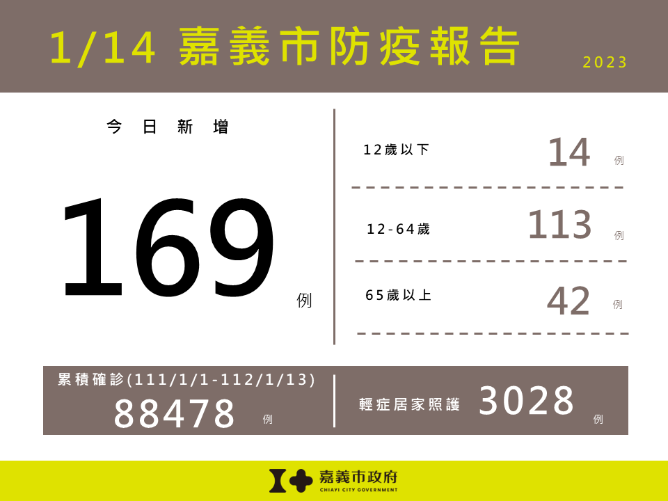 中央流行疫情指揮中心今(1/14)日公布嘉義市新增169例確診個案,包含12歲以下14例,12-64歲113例,65歲以上42例。嘉義市目前輕症居家照護人數3,028人。111/1/1截至112/1/13嘉義市累計確診嚴重特殊傳染性肺炎本土病例數為88,478人。 衛生局提醒,請大家儘速接種疫苗,並持續落實勤洗手、咳嗽禮節及佩戴口罩等防疫措施,避免出入人多擁擠的場所及高感染傳播風險場域,如出現疑似症狀,儘速快篩就醫和遵從醫囑及早服藥,降低重症及死亡風險;並請養成規律運動、均衡飲食、充足睡眠、壓力調適、不吸菸等健康習慣,提升免疫力,守護自己與家人的健康。