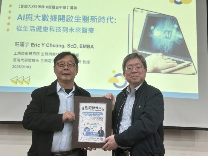 為積極推動科普教育,國立彰化師範大學、國立自然科學博物館攜手台中市教育局優遊台中學,共同策劃辦理「傑出科普講座」,第三場次今(3)日在新社高中登場,邀請工業技術研究院生醫與醫材研究所長莊曜宇博士,以「AI大數據開啟生醫新時代:從生活健康科技到未來醫療」為題,深入剖析人工智慧如何翻轉醫療現況,引領師生探索生物科技與資訊及通訊科技(BIO+ICT)跨域融合的創新趨勢。