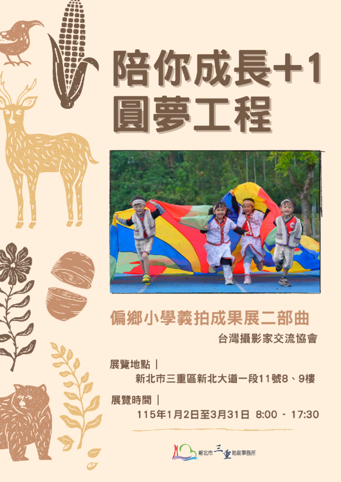 為持續優化機關環境之美學氛圍,新北市三重地政事務所再度與台灣攝影家交流協會攜手,舉辦「陪你成長+1圓夢工程――偏鄉小學義拍成果展」二部曲,展期自115年1月2日起至3月31日止,歡迎市民蒞臨參觀,感受鏡頭下最真摯的溫暖故事。
