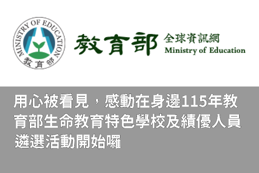 歡迎各級學校鼓勵師長們一起參與「115年教育部生命教育特色學校及績優人員」遴選,讓用心被看見,讓感動成為教育持續前行的動力!相關遴選辦法,請參閱「教育部學生事務及特殊教育司網站」(https://reurl.cc/MRRVZW)。