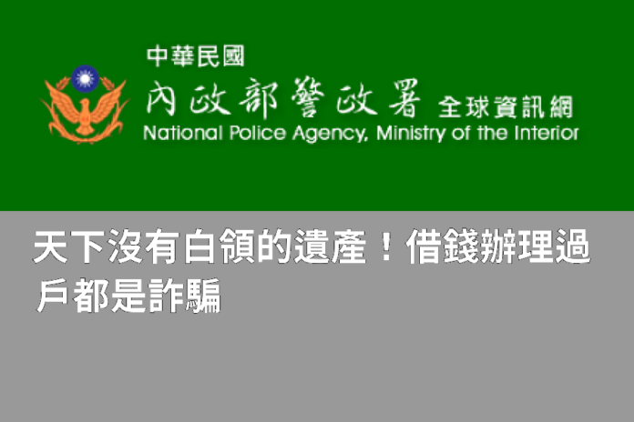 刑事局呼籲,天上不會掉下遺產, 遺產繼承有嚴格的法律程序與順位,若與死者無親無故,卻被告知有相關遺產報酬可領,100% 是詐騙。正規的遺產處理程序中,相關稅費通常會從遺產總額中扣除,或由法定繼承人自行繳納,絕不會隨機找陌生人「借錢」處理。若收到自稱律師或銀行員的訊息,請務必透過官方管道查詢。可使用法務部律師查詢系統核實身分,而非撥打訊息中提供的聯絡電話。凡是提及「借錢」、「代墊費用」、「高額佣金」等關鍵字,民眾務必提高警覺。若有任何疑慮,請立即撥打 165 反詐騙諮詢專線或撥打 110 報案,亦可透過打詐儀錶板獲取最新防詐資訊。