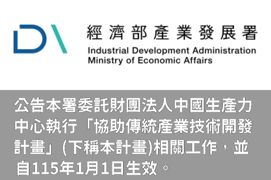 產經消費公告本署委託財團法人中國生產力中心執行「協助傳統產業技術開發計畫」(下稱本計畫)相關工作,並自115年1月1日生效。 產經消費 公告本署委託財團法人中國生產力中心執行「協助傳統產業技術開發計畫」(下稱本計畫)相關工作,並自115年1月1日生效。 編輯 江 秉鈞 2026-01-06 依據:一、經濟部協助產業創新活動補助獎勵及輔導辦法第3條。 二、行政程序法第16條第2項。 Tags經濟部產業發展署 延伸閱讀 商情 不只是健身而已!這間板橋格鬥館讓你學會如何保護自己! 商情 桃園崧宇廣告專業LED招牌工程打造北部地區吸睛店面 商情 崧宇廣告–桃園廣告招牌設計製作、北部LED招牌推薦 商情 屏東iPhone維修官方授權IRP鼎級手機維修中心