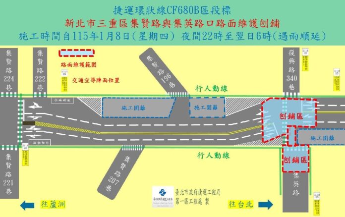 施工單位將自115年1月8日(四)夜間22時起,進行捷運中央避車線三重區集賢路與集英路口路面維護刨舖施工作業,遇雨將擇日再施工,施工範圍如附圖。 施工作業期間請用路人行經施工區域減速慢行,並依改道後之宣導牌面、遵循導引標誌及現場指揮人員導引指示減速慢行,以確保行車安全。施工期間民眾如有任何問題以及建議事項,或想瞭解最新施工動態,可隨時利用下列聯絡電話反映,將有專人竭誠為您服務與解說,施工造成暫時不便,敬請見諒。