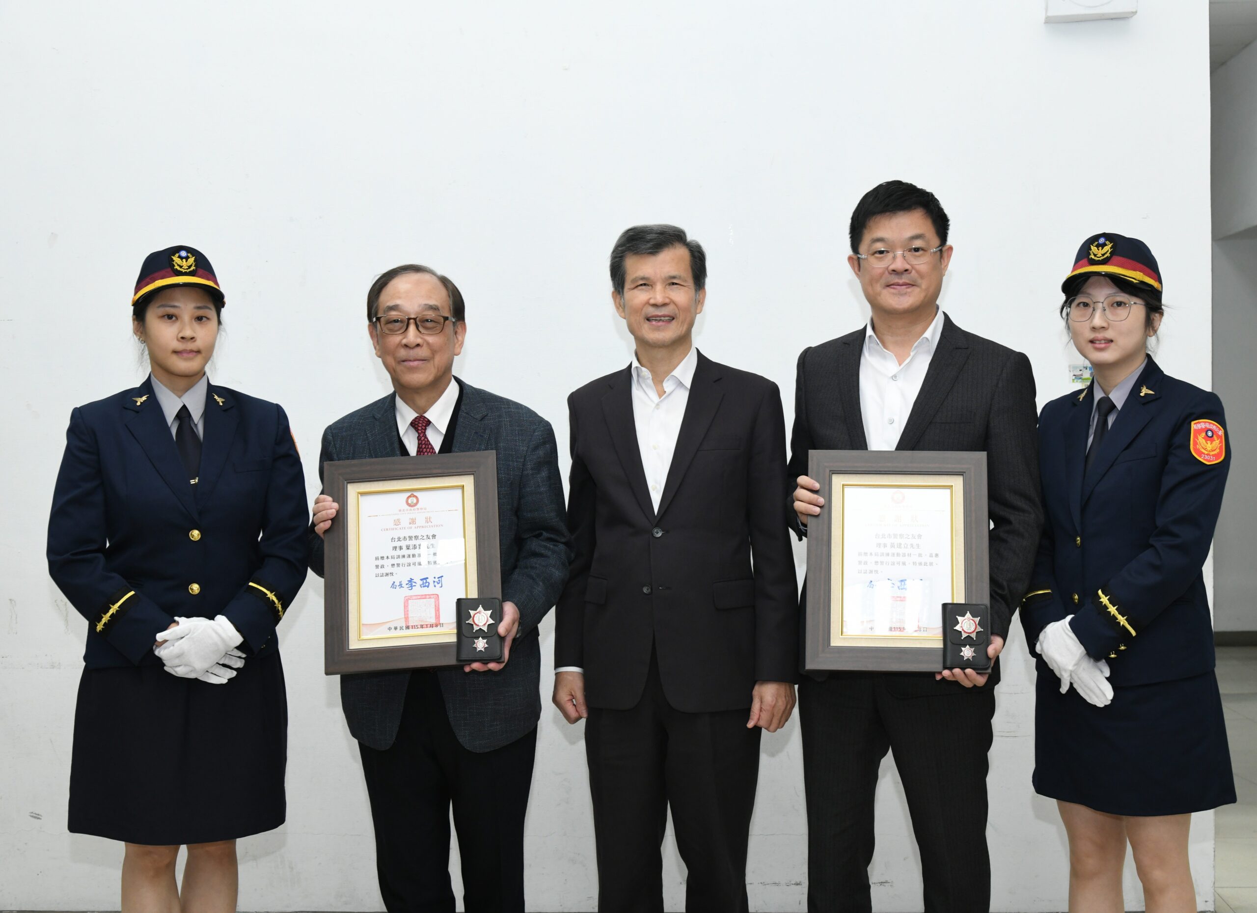 警察局局長李西河對台北市警察之友會的支持表達誠摯感謝,特頒贈感謝狀及「力行」榮譽章,衷心感謝警友們無私的奉獻。並強調將善用該器材,加強訓練優化員警身心健康,並以最佳體能狀態守護市民安全。