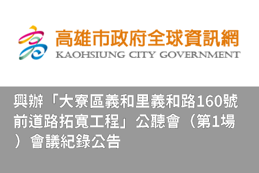 南部新聞高雄市興辦「大寮區義和里義和路160號前道路拓寬工程」公聽會(第1場)會議紀錄公告 南部新聞高雄市 興辦「大寮區義和里義和路160號前道路拓寬工程」公聽會(第1場)會議紀錄公告 編輯 劉 大龍 2026-01-09 興辦「大寮區義和里義和路160號前道路拓寬工程」公聽會(第1場)會議紀錄。如附件!! 函-會議紀錄.pdf 延伸閱讀 商情 總興實業深耕60年食品機械,第三代接班開啟全球布局 商情 旺德富工程行-台北新北廢棄物清運、新北裝潢廢棄物清運 商情 不只是健身而已!這間板橋格鬥館讓你學會如何保護自己! 商情 桃園崧宇廣告專業LED招牌工程打造北部地區吸睛店面