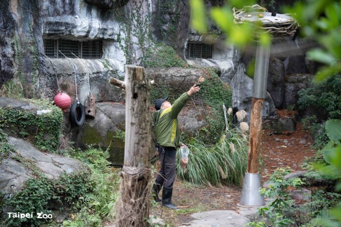 在野外山林中,雜食性的黑熊食物來源相當多樣,有地面、枯枝落葉或土堆等需要翻動挖掘的地方,以及樹上需要攀爬抓取的位置。為了促進動物園照養的黑熊展現自然覓食行為,保育員特別構思了新的行為豐富化設施,遠看就像棵樹木拔地而起,頂部又狀似鳥巢可以乘載物體。行為豐富化設計的立柱採用圓杉木,除了以自然素材提升觸感,也方便更換或調整高度,鐵製套筒則是避免黑熊攀爬造成危險。新行豐設施主要是利用黑熊敏銳的嗅覺,引導動物在採食過程中運用不同肢體部位與身體肌群,提高取食難度也延長進食時間。