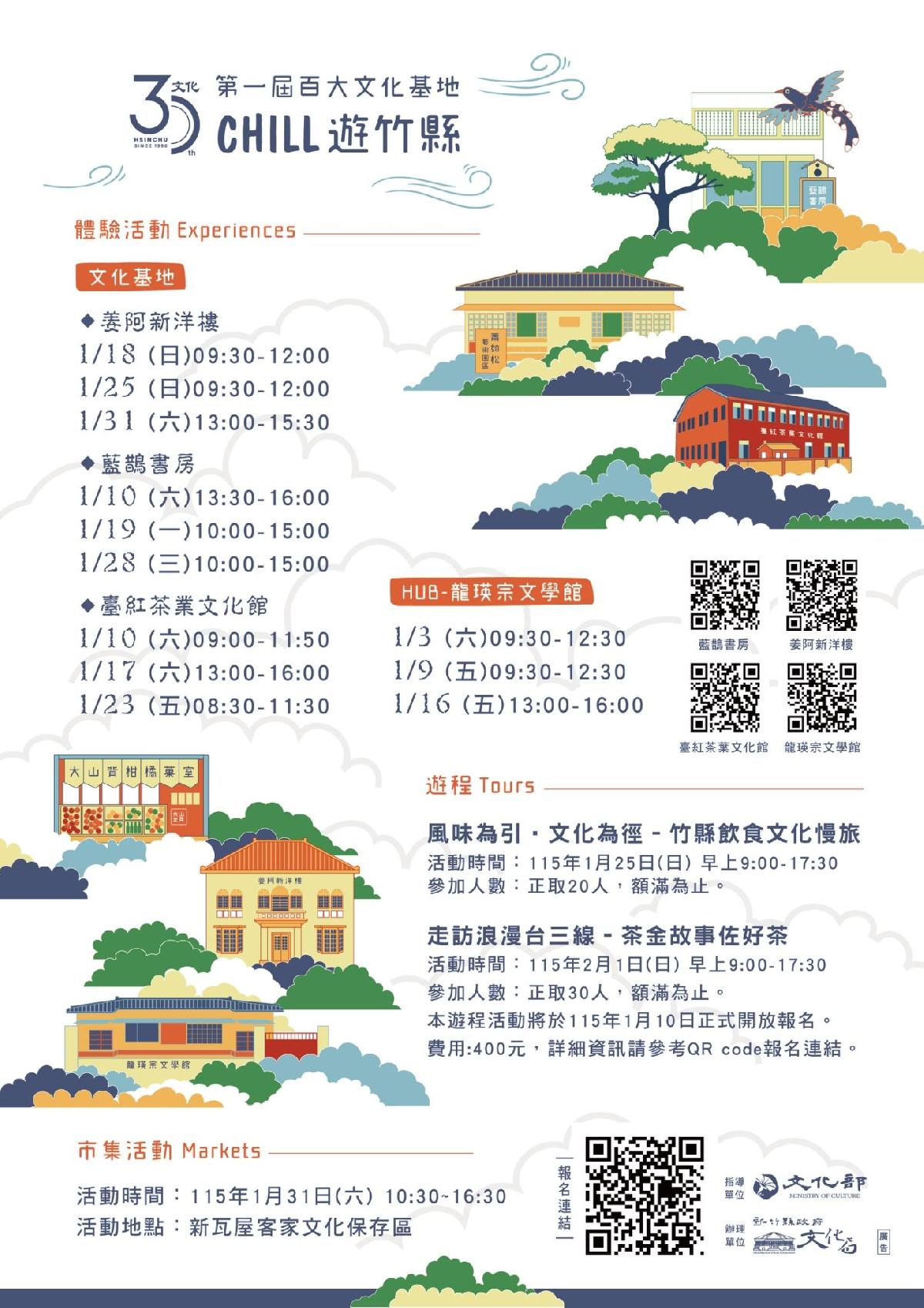 新竹縣第一屆百大文化基地活動「Chill遊竹縣」,由龍瑛宗文學館擔任HUB(文化基地樞紐平臺),向外串聯5大基地,包含橫山鄉大山北月、北埔鄉藍鵲書房、姜阿新洋樓、關西鎮臺紅茶業文化館及竹東鎮蕭如松藝術園區,共規劃18場體驗活動,2條展現竹縣風貌的遊程,1月10日起開放報名,民眾報名手作體驗、走讀活動,還能參加集章活動,兌換限量文化基地特色產品!