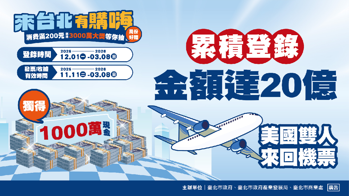 臺北市旅遊與消費熱度持續攀升,臺北市政府推出的「來台北有購嗨 消費歡樂抽」活動,自開跑以來獲得民眾熱烈響應,累積發票登錄金額已正式突破20億元,為回饋民眾對於消費抽獎活動的熱情參與,活動已於本週三(7日)率先抽出達標加碼抽第二組「美國雙人來回機票」送給新星的幸運兒!另外,隨著活動熱度持續延燒,登錄金額也增加越來越快,第三組幸運兒可預期將更快誕生。