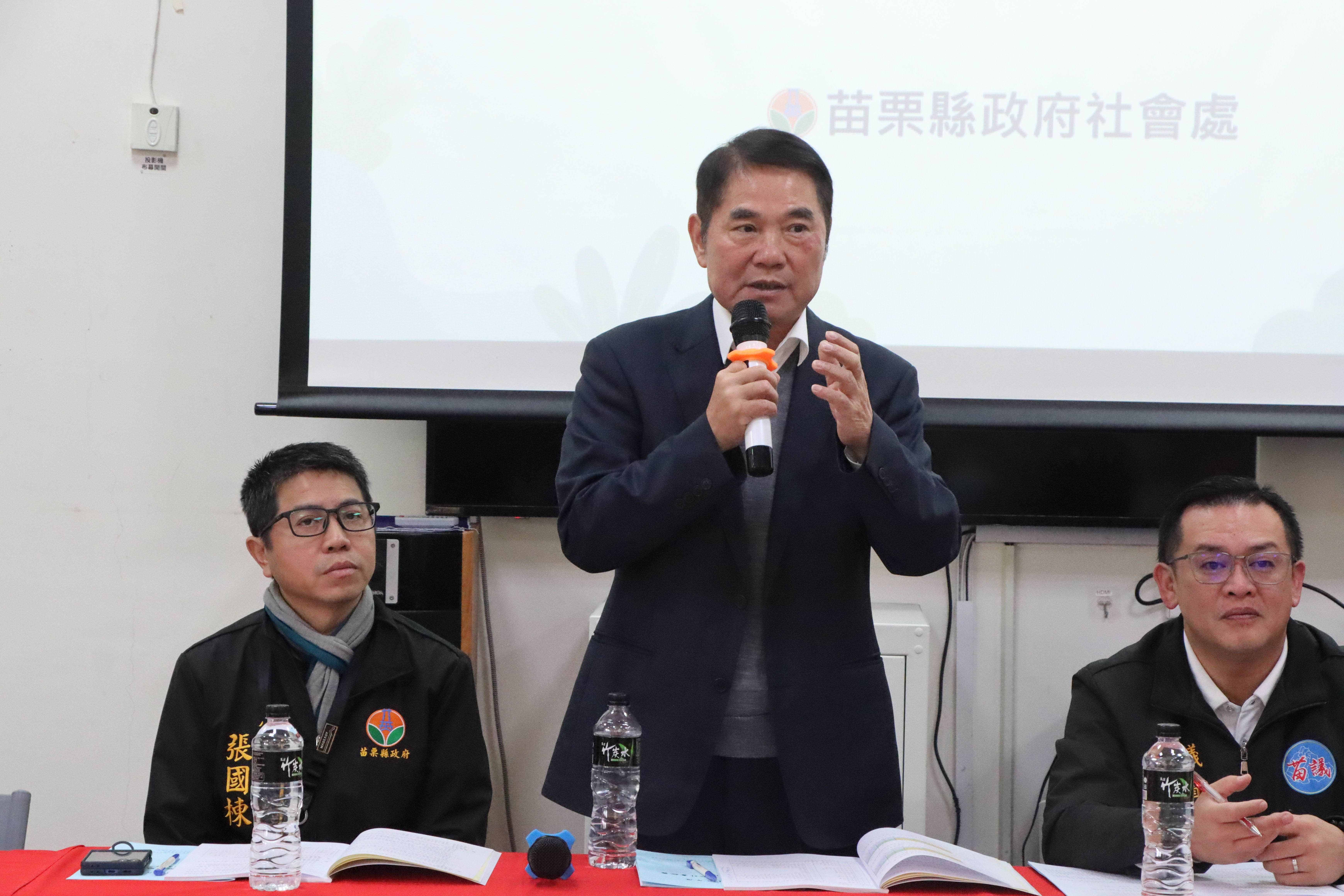 苗栗縣政府9日上午在頭份市民生社區活動中心舉辦「115年度社區照顧關懷據點計畫經費說明會」第三場活動,出席鄉鎮包括竹南鎮、後龍鎮、造橋鄉、頭份市、南庄鄉及三灣鄉。縣長鍾東錦偕同社會處長張國棟、老人福利科長張瑞瑜,並邀集議員徐功凡、蕭詠萱等各界代表共同參與,與社區工作人員面對面交流,詳細說明政策方向及經費調整內容。