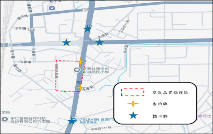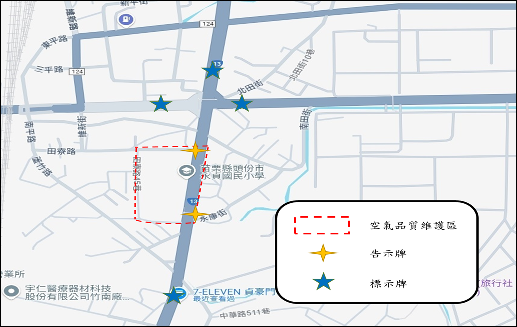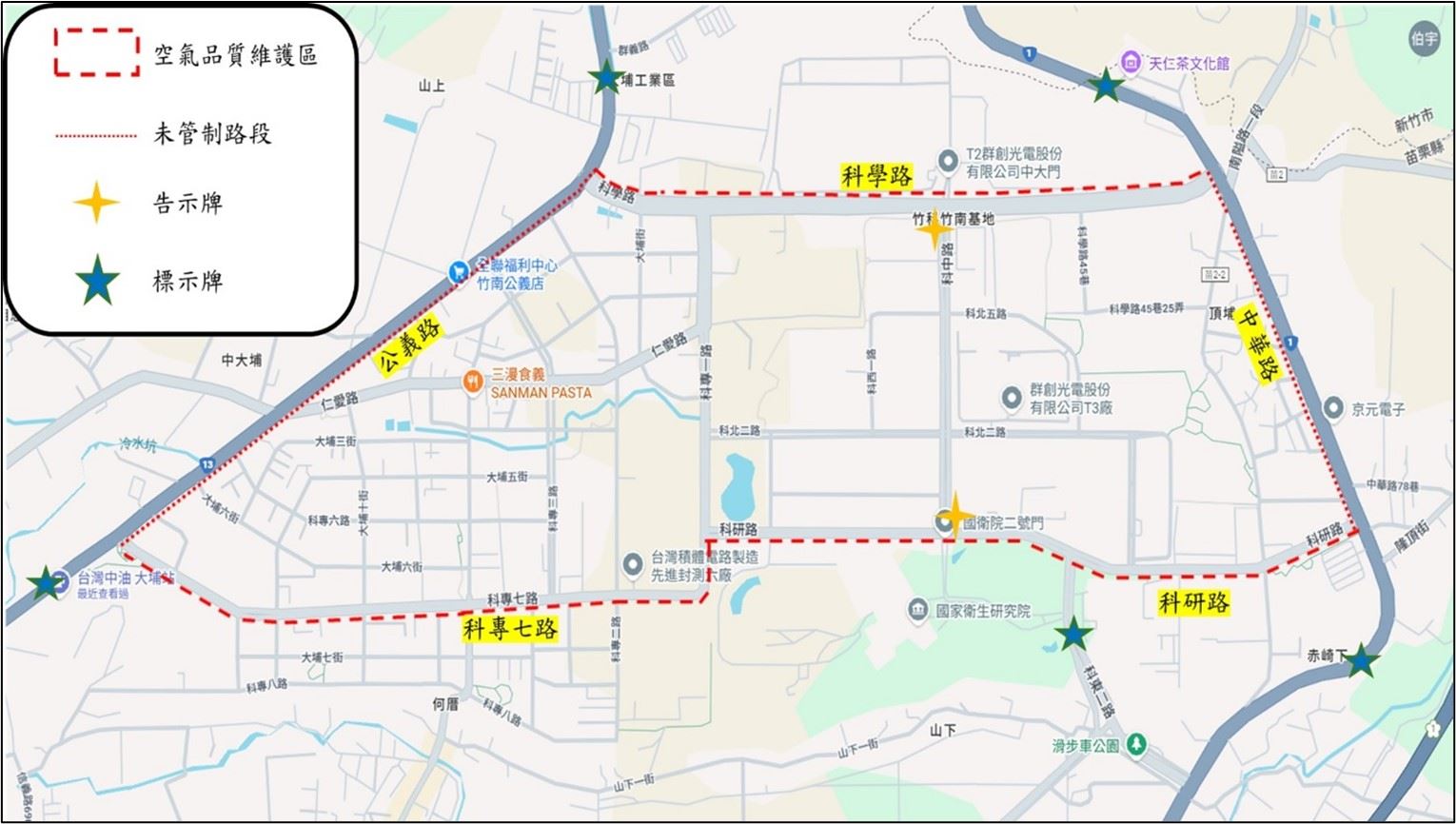 為加強移動污染源管制之效益,「永貞國小及竹南園區空維區」除原公告之管制對象(柴油大客車、大貨車及燃油機車)外,分別新增管制柴油小貨車及柴油施工機具。其管制範圍詳如附圖所示,新增管制措施如下: