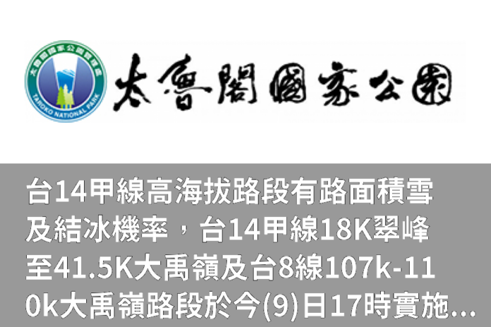 依目前中央氣象署情資顯示,受強烈大陸冷氣團影響,台14甲線3,000公尺以上高海拔路段夜間溫度降至0度以下,道路有路面積雪及結冰機率;為維用路人車安全,本局台14甲線18K翠峰至41.5K大禹嶺及台8線107k-110k大禹嶺路段,於今(9)日17時實施道路預警性封閉措施(車輛只出不進;另考量台14甲線31.7K武嶺至32.7K松雪樓路段崎嶇蜿蜒,易發生打滑情形,該路段將「雙向封閉」管制,禁止通行),並於翌(10)日早上7時視天候及道路狀況再決定「限加掛雪鏈車輛通行」或「開放通行」。請用路人提前確認天氣與路況,隨車需攜帶雪鏈因應並小心慢行。