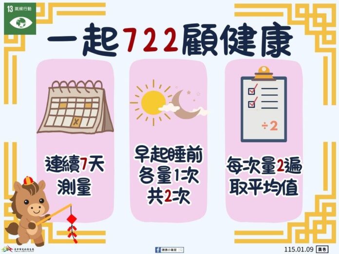 此外,衛生局指出,預防心臟病與腦中風,日常血壓管理相當重要,建議民眾落實「722居家血壓量測」原則,即連續7天量測,於早上起床後與晚上睡前各量1次,每次量測2遍取平均值。透過規律監測血壓變化,有助於及早發現異常,降低心血管疾病與腦中風的發生風險。