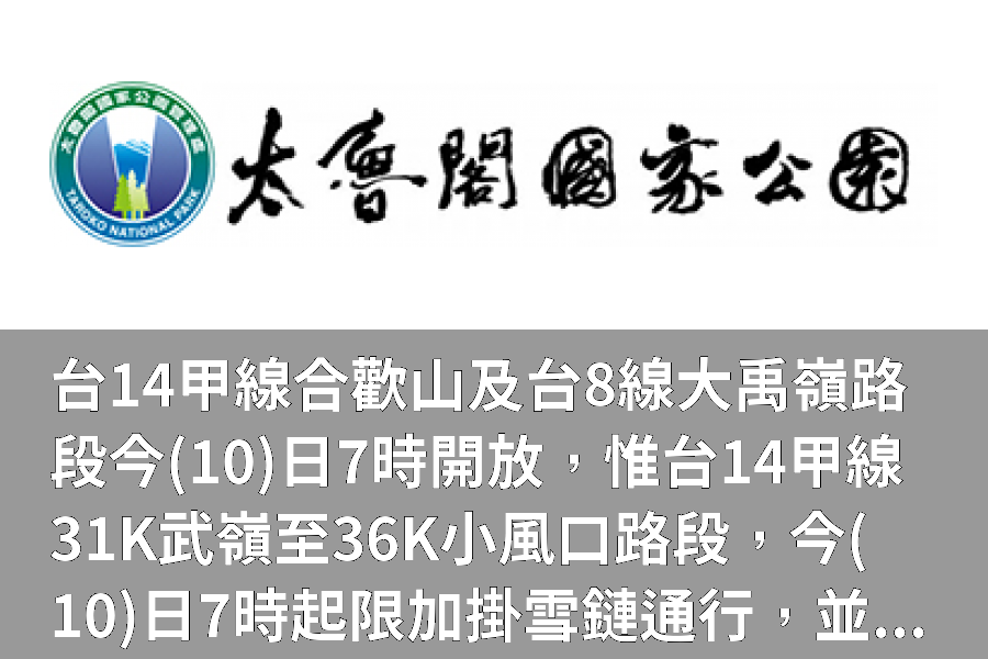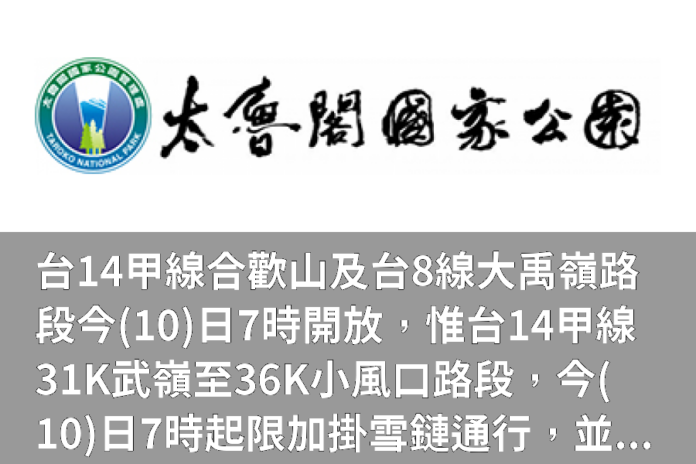 台14甲線18K翠峰至41.5K大禹嶺及台8線107K至110K大禹嶺路段昨(9)夜實施預警性封閉路段,將於今(10)日7時解除恢復交通。惟經本局派員檢視路況,台14甲線31K武嶺至36K小風口路段部分路面(肩)仍結冰(積雪)未融,限加掛雪鏈通行,視路況機動調整限掛雪鏈通行路段。考量前揭管制路段武嶺至松雪樓路段道路崎嶇蜿蜒,背陽側路面結冰較厚,極易發生打滑失控,建議採四輪傳動車輛加掛雪鏈通行。