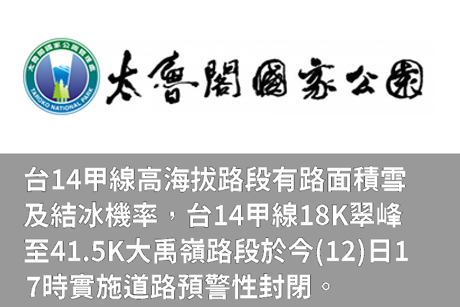 依目前中央氣象署情資顯示,受強烈大陸冷氣團影響,台14甲線3,000公尺以上高海拔路段夜間溫度降至0度以下,道路有路面積雪及結冰機率;為維用路人車安全,本局台14甲線18K翠峰至41.5K大禹嶺路段,於今(12)日17時實施道路預警性封閉措施(車輛只出不進;另考量台14甲線31.7K武嶺至32.7K松雪樓路段崎嶇蜿蜒,易發生打滑情形,該路段將「雙向封閉」管制,禁止通行),並於翌(13)日早上7時視天候及道路狀況再決定「限加掛雪鏈車輛通行」或「開放通行」。請用路人提前確認天氣與路況,隨車需攜帶雪鏈因應並小心慢行。