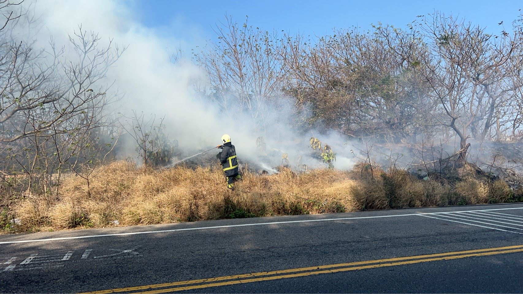 抵達現場,起火點位於大片雜草,燃燒面積約達 50 平方公尺。受風勢影響,灰煙不斷竄向鄰近道路,導致視線模糊,對過往用路人造成極大不便與危險。為確保交通安全,救災人員迅速佈署水線灌救,有效壓制火勢並將濃煙阻斷,並確認殘火至完全熄滅。