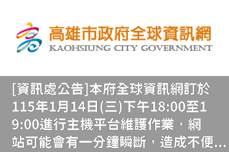 南部新聞高雄市 本府全球資訊網訂於115年1月14日(三)下午18:00至19:00進行主機平台維護作業,網站可能會有一分鐘瞬斷,造成不便之處,尚請見諒。 南部新聞高雄市 [資訊處公告] 本府全球資訊網訂於115年1月14日(三)下午18:00至19:00進行主機平台維護作業,網站可能會有一分鐘瞬斷,造成不便之處,尚請見諒。 編輯 劉 大龍 2026-01-12 [資訊處公告] 本府全球資訊網訂於115年1月14日(三)下午18:00至19:00進行主機平台維護作業,網站可能會有一分鐘瞬斷,造成不便之處,尚請見諒。 延伸閱讀 商情 總興實業深耕60年食品機械,第三代接班開啟全球布局 商情 旺德富工程行-台北新北廢棄物清運、新北裝潢廢棄物清運 商情 不只是健身而已!這間板橋格鬥館讓你學會如何保護自己! 商情 桃園崧宇廣告專業LED招牌工程打造北部地區吸睛店面