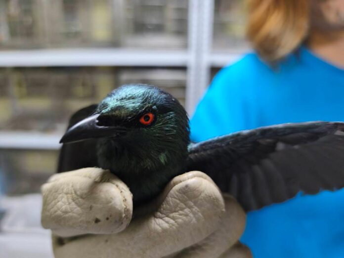 新北動保員程沛宏表示,當日帶回交由獸醫師細心檢診,羽翼無損、精神狀況良好,觀察應無撞擊產生腦震盪現象發生,翌日便將牠帶出野外,後便讓牠展翅重返天空。亞洲輝椋鳥又名菲律賓輝椋鳥,為椋鳥科雀鳥。牠體型略小於八哥,體長約17到20公分,眼睛呈現吸血鬼般血紅色。早年,牠是台灣進口寵物鳥,後來因棄養或逃逸,導致野外族群數量大幅增加。在台灣,亞洲輝椋鳥主要棲息於都會區,常能看到牠穿梭在行道樹與高樓大廈之間。