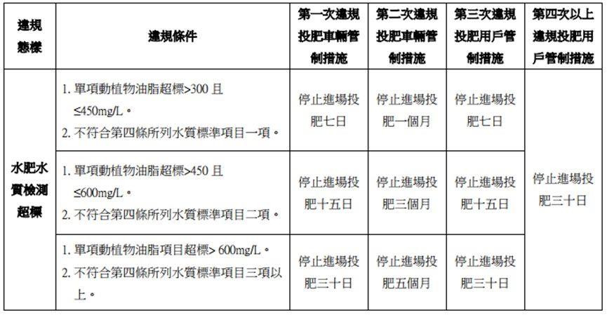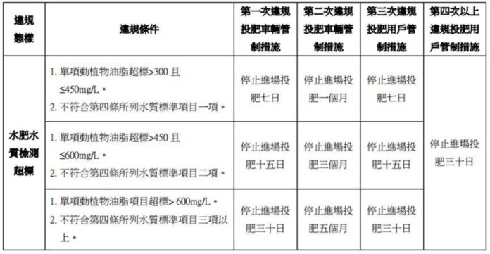 為確保水肥投入作業順暢,黃邰聰進一步說明,領有投肥證之水肥車進入投入站時,衛工處將即時進行pH值檢測,若pH值低於5或高於9,將暫停其進場投肥並退運;另如經檢驗發現油脂、懸浮固體物或溶解性鐵等水質項目不符規定,將依前述管理辦法第12條規定,對該水肥車實施停投管制。