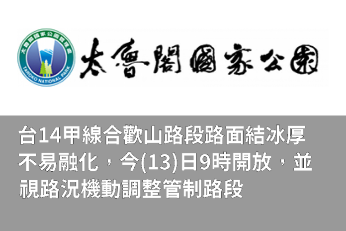 台14甲線18K翠峰至41.5K大禹嶺昨(12)夜實施預警性封閉路段,惟經本局派員檢視路況,台14甲線29K昆陽至41.5K大禹嶺路段部分路面(肩)仍結冰(積雪)未融,車輛行駛易有打滑無法行駛,為維護用路人行車安全,將延至今(13)日9時解除恢復交通(視路面結冰融化情形),並視路況機動調整限掛雪鏈路段。