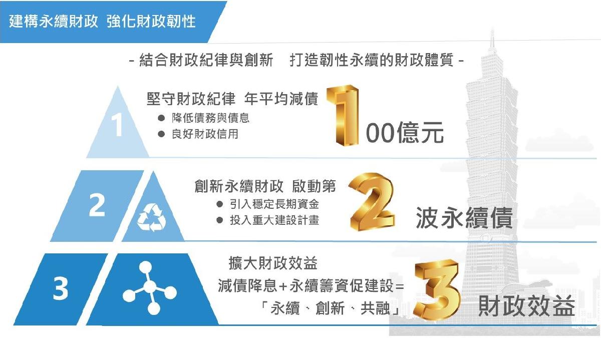 臺北市政府財政局面對國內外政經環境變化帶來的財政變數,持續積極致力於建構健全且具韌性的財政環境,提升財務資源運用效能,同時在順利推動各項市政建設之前提下,依公共債務法規定,達成加速減債目標。