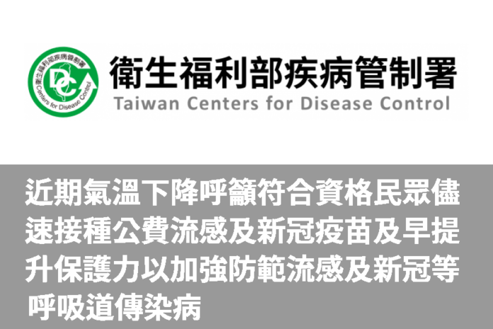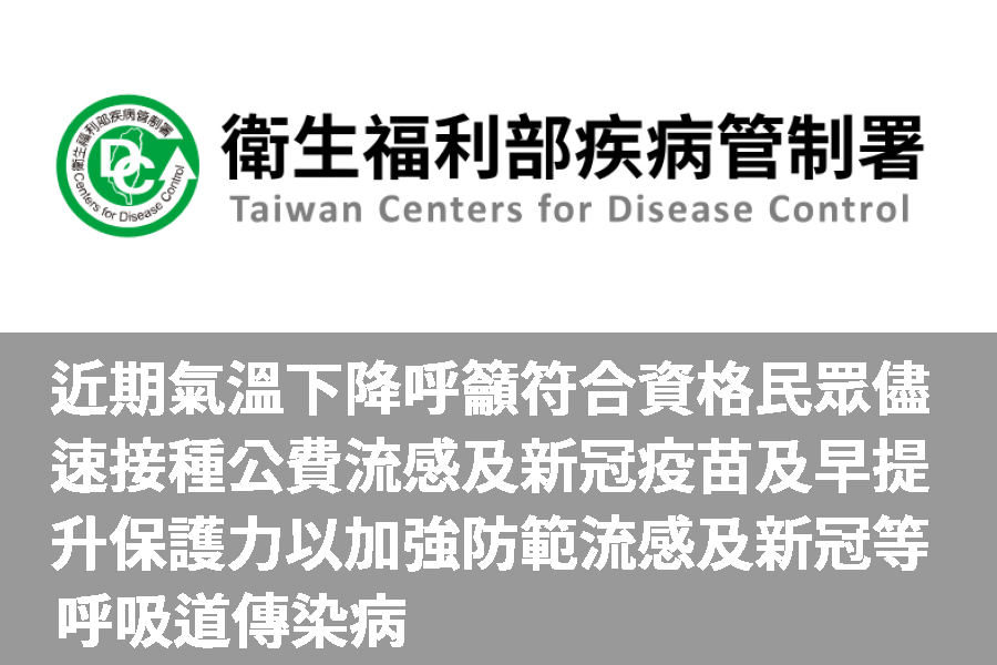 衛生福利近期氣溫下降 呼籲符合資格民眾儘速接種公費流感及新冠疫苗 及早提升保護力 以加強防範流感及新冠等呼吸道傳染病
