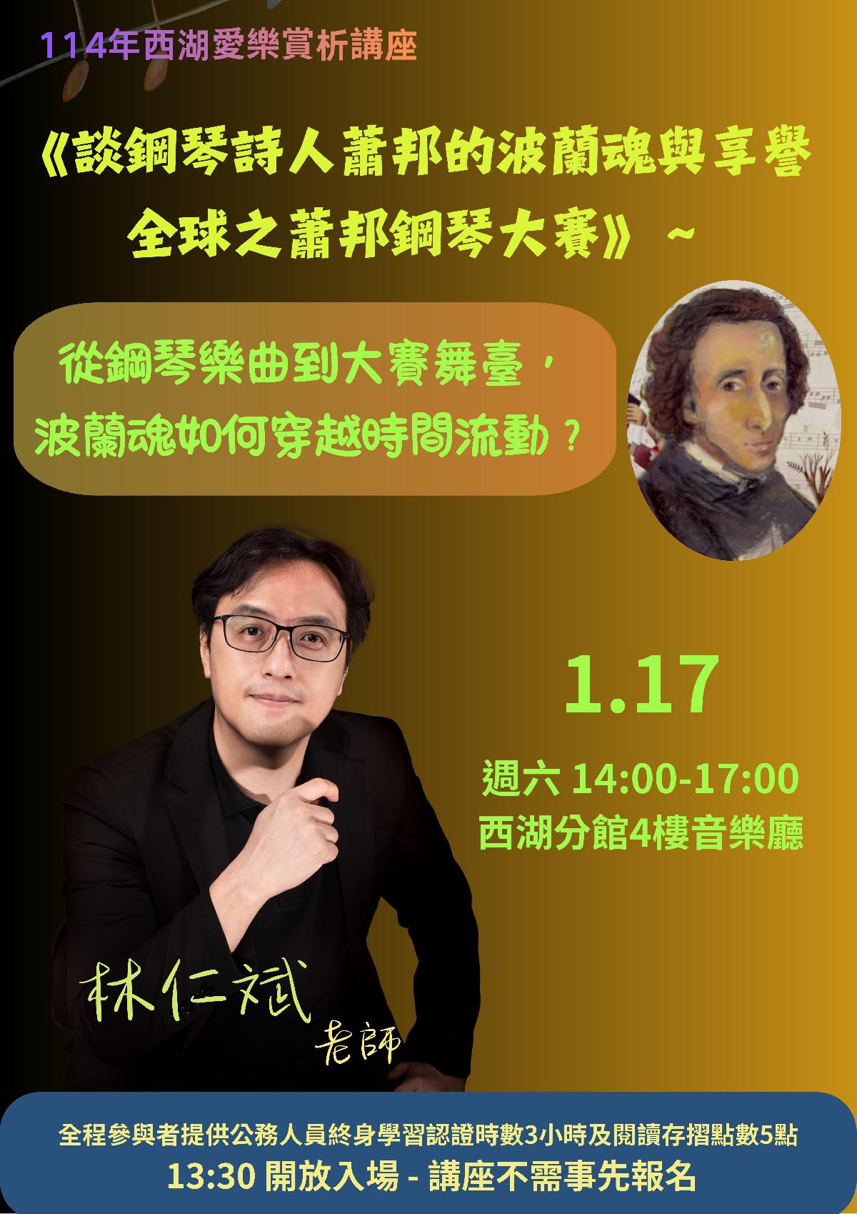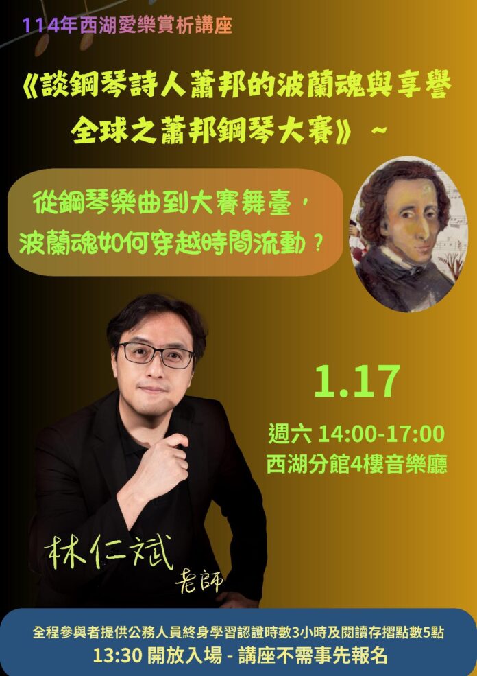 臺北市立圖書館西湖分館將於1月17日(週六)下午2時辦理「《談鋼琴詩人蕭邦的波蘭魂與享譽全球之蕭邦鋼琴大賽》〜從鋼琴樂曲到大賽舞臺,波蘭魂如何穿越時間流動?」講座,邀請台灣蹦藝術協會理事長林仁斌老師為市民導聆。