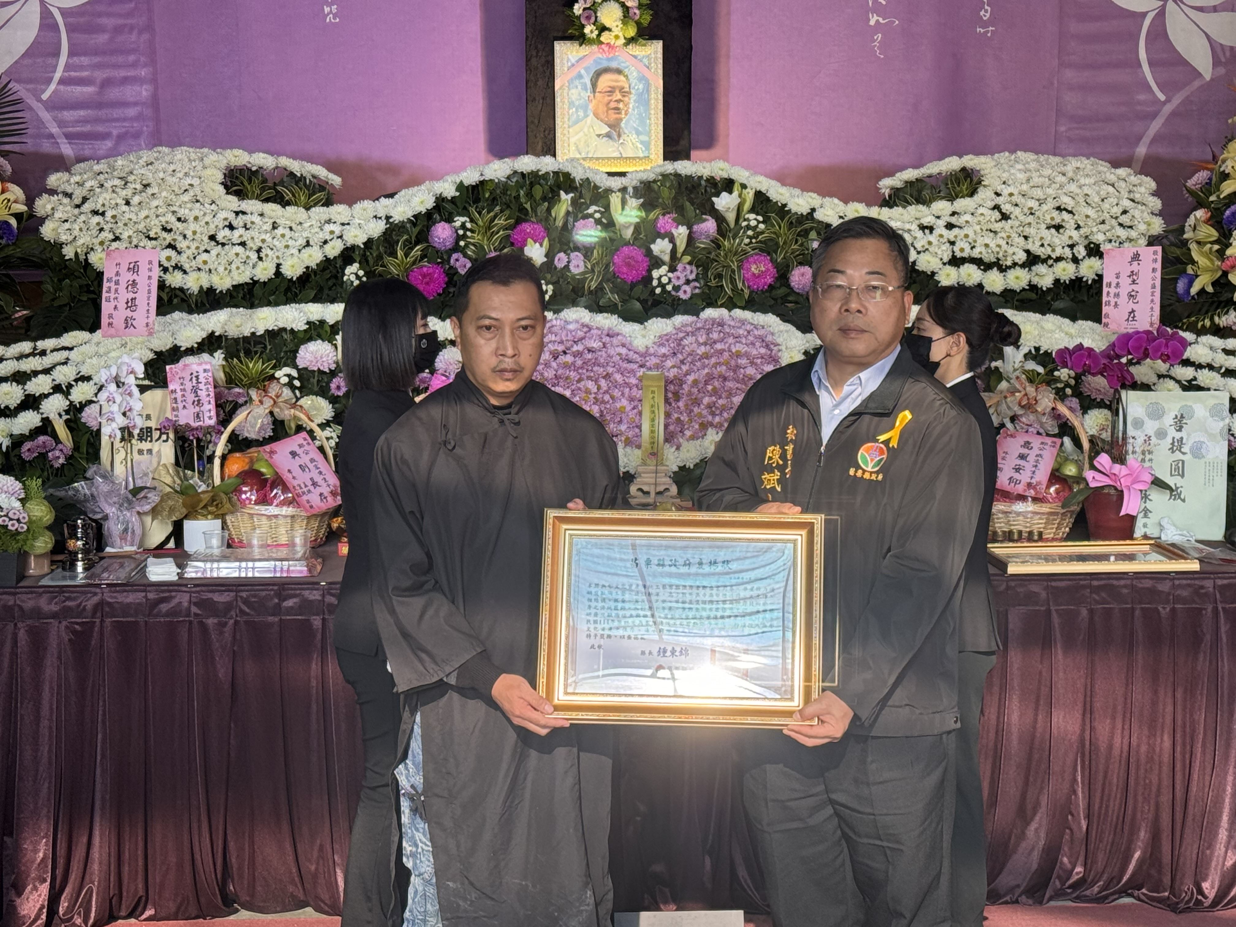 苗栗縣無形文化資產傳統工藝剪黏保存者鄭盛宏於115年1月2日與世長辭,今(14)日由苗栗縣政府陳斌山秘書長代表頒贈褒揚狀予長子鄭俊祺先生,以感念其對無形文化資產保存、傳承與維護工作之貢獻。