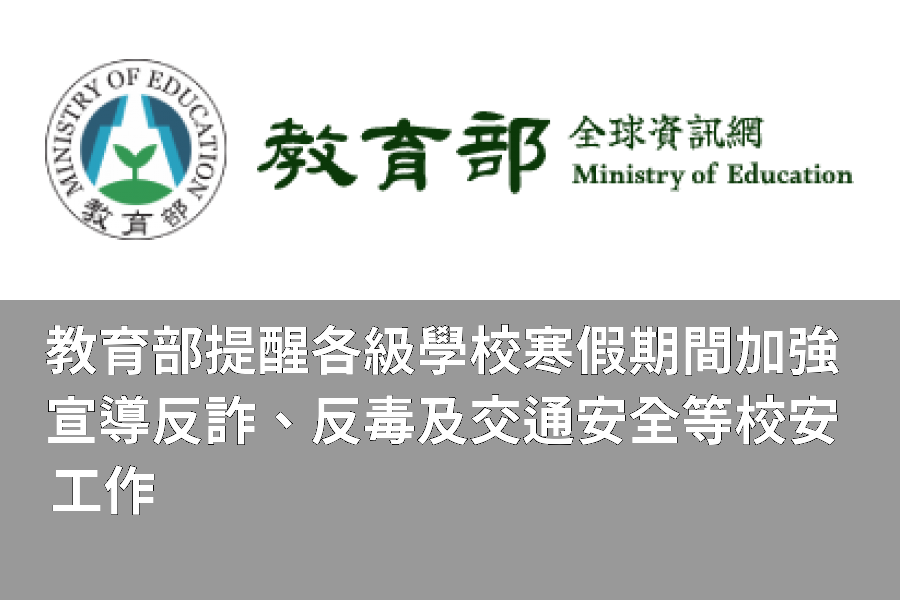 115年寒假期間,教育部提醒全國各級學校加強反詐、反毒及交通安全等工作,避免學生涉足不良場所或從事無安全規劃的活動,以維護學生健康及安全。此外,社群平臺(含境外APP)涉詐騙案件持續攀升,也須提醒學生勿輕易提供個人帳戶資料及謹慎使用第三方支付平臺,及避免協助他人領取金錢,以防遭不法分子詐騙及利用,並可透過手機下載「警政服務APP」,或上網查詢內政部警政署「165全民防騙網」(網址:http://165.npa.gov.tw/#/),獲取最新詐騙手法知識及相關反詐騙諮詢服務,避免成為詐騙受害者。