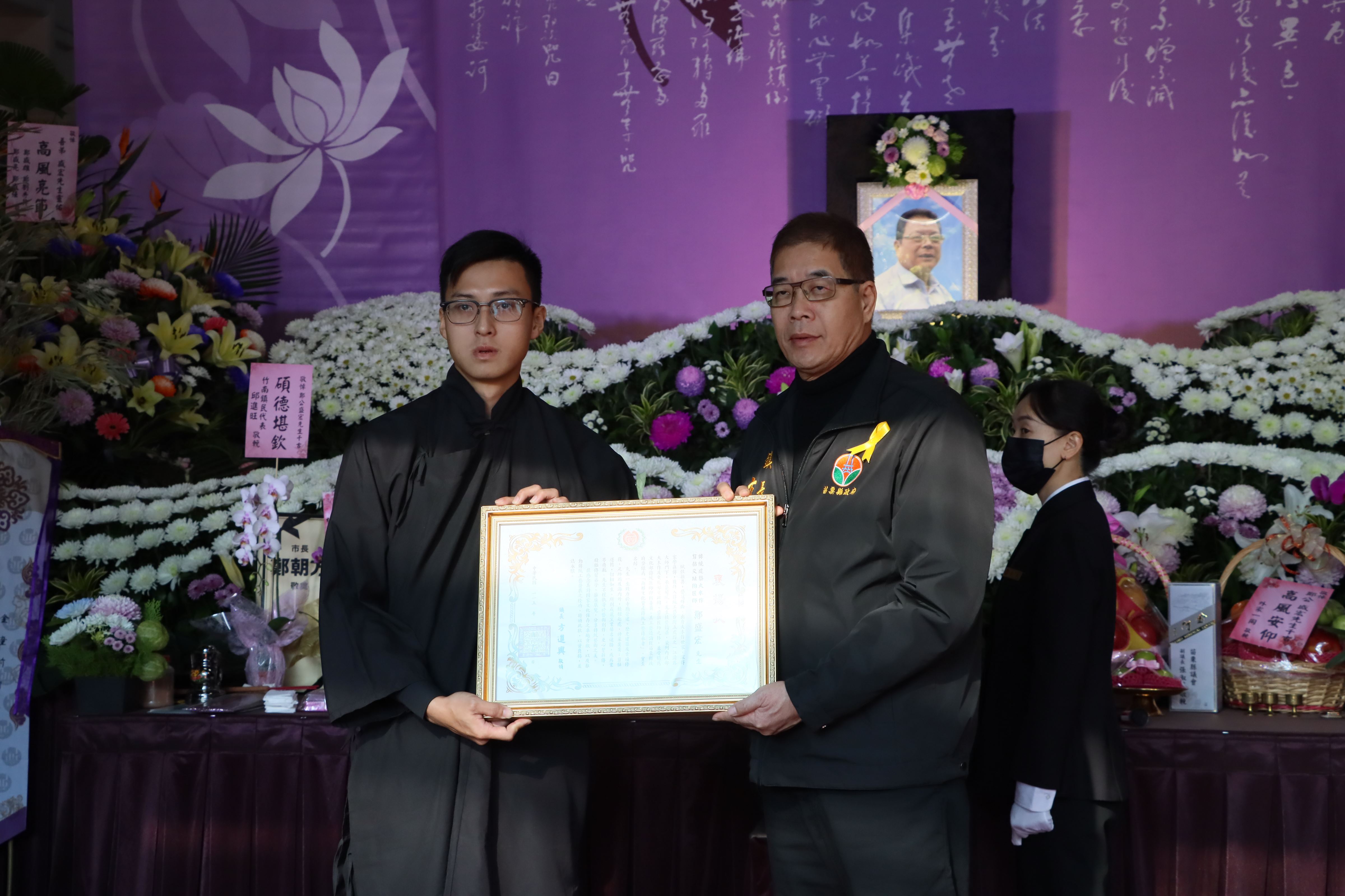 苗栗縣無形文化資產傳統工藝剪黏保存者鄭盛宏於115年1月2日與世長辭,今(14)日由苗栗縣政府陳斌山秘書長代表鍾東錦縣長頒贈褒揚狀予長子鄭俊祺先生,以感念其對無形文化資產保存、傳承與維護工作之貢獻,另文化部文資局陳濟民局長及竹南鎮長方進興亦頒發旌揚狀。