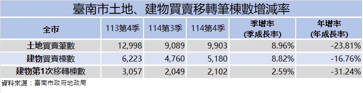 臺南市不動產交易114年第4季土地與建物買賣移轉統計資料出爐,本季土地買賣筆數為9,903筆,與前季相比,增幅為8.96%,而與113年第4季相較,減幅達23.81%。本季建物買賣棟數為5,180棟,較上季增加8.82%,與113年第4季相比衰退16.76%;其中,建物辦竣第一次登記後移轉棟數為2,102棟,占建物總移轉比例40.58%。觀察臺南市114年第4季不動產交易情形,土地及建物買賣移轉量相較於前一季均呈現回溫,惟與113年同期相比,整體交易量仍明顯下滑,顯示市場短期交易回溫,但中長期仍受景氣及政策因素影響。後續市場發展,仍受整體經濟情勢、金融貸款政策及購屋者信心之影響。