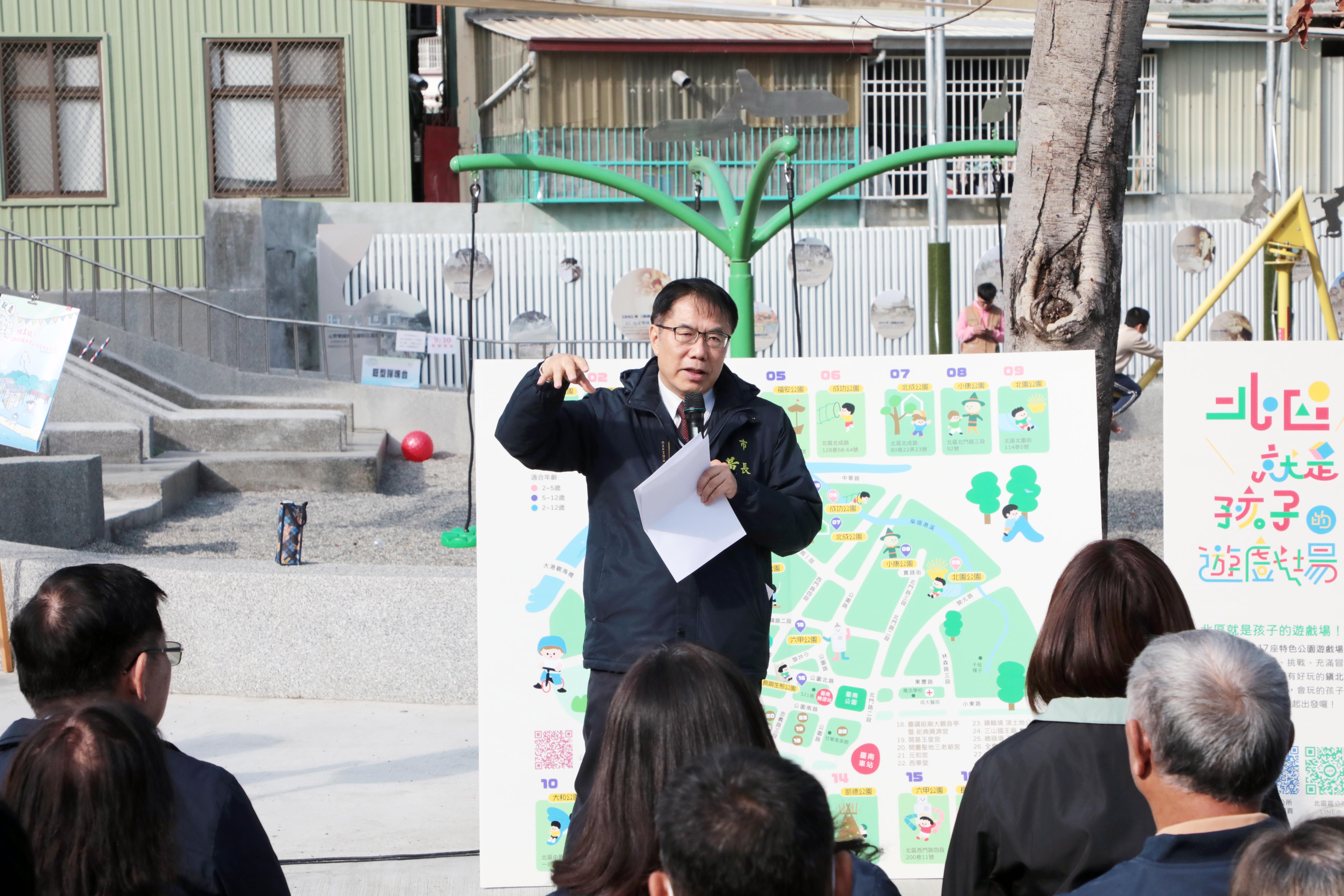 黃偉哲表示,北區的里長與居民都十分用心,與積極爭取建設的區長通力合作,已完成十七座特色遊戲場,未來市府也會持續增加特色遊具與功能設施,一步一步提升各區的公園品質,讓下一代擁有更好的成長環境。