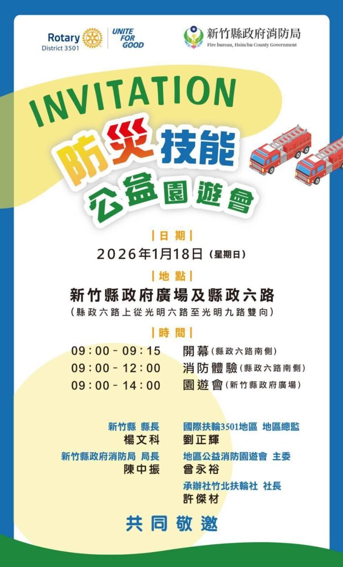 為提升民眾防災知能,將防災教育落實於日常生活,新竹縣政府消防局與國際扶輪3501地區攜手合作,將於1月18日上午8時至下午2時,於縣府廣場及縣政六路舉辦「防災技能公益園遊會」,邀請民眾透過實際體驗方式,學習正確的防災與救護技能。