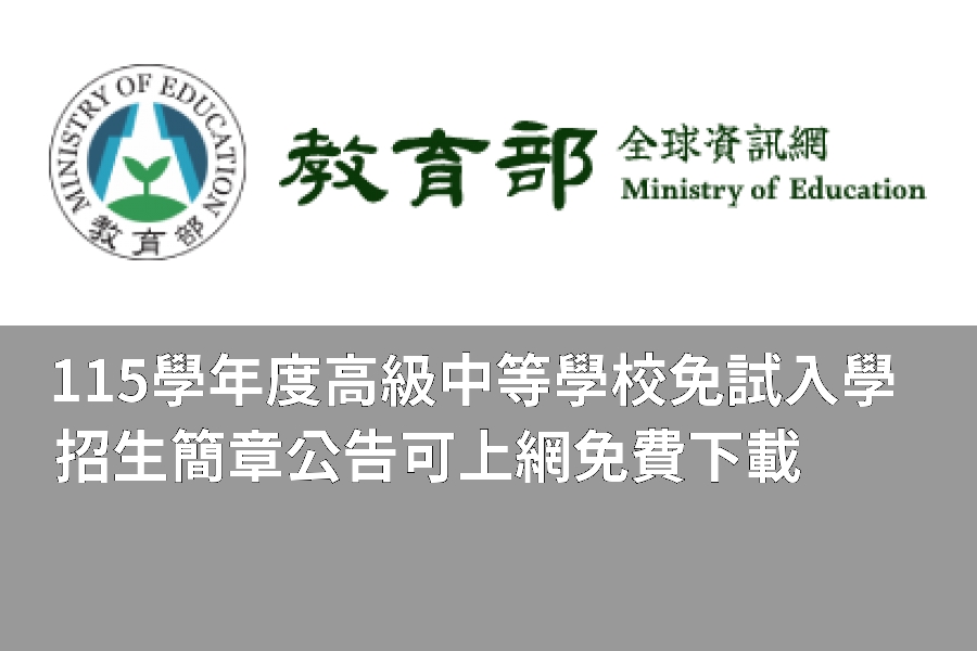 為持續推動高級中等學校免試入學制度,教育部國教署提供「量足、質優、多元化」的就學機會供學生適性選擇,包括:分區免試入學、優先免試入學、直升入學、技優甄審入學、學習區完全免試入學及免試入學單獨招生(不含實用技能學程、建教合作班)等多元管道。115學年度免試入學總名額計18萬4,459名,占核定招生總名額90.42%,各就學區皆達「占核定招生總名額85%以上」政策目標。招生簡章於15日公告,預計7月7日放榜,7月9日報到,請務必依簡章所訂時程,辦理相關事宜。