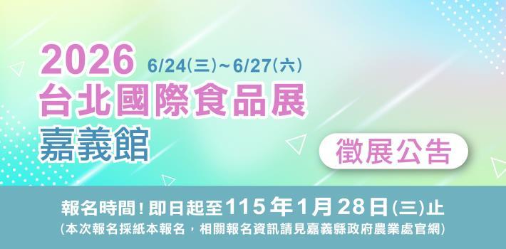 為提升嘉義縣農特產品的國際能見度,嘉義縣政府積極參與國際食品展,協助農民及業者拓展外銷通路,2026年台北國際食品展覽會將在115年6月24日至27日於台北南港展覽館2館登場,邀請嘉義縣業者踴躍報名參展。