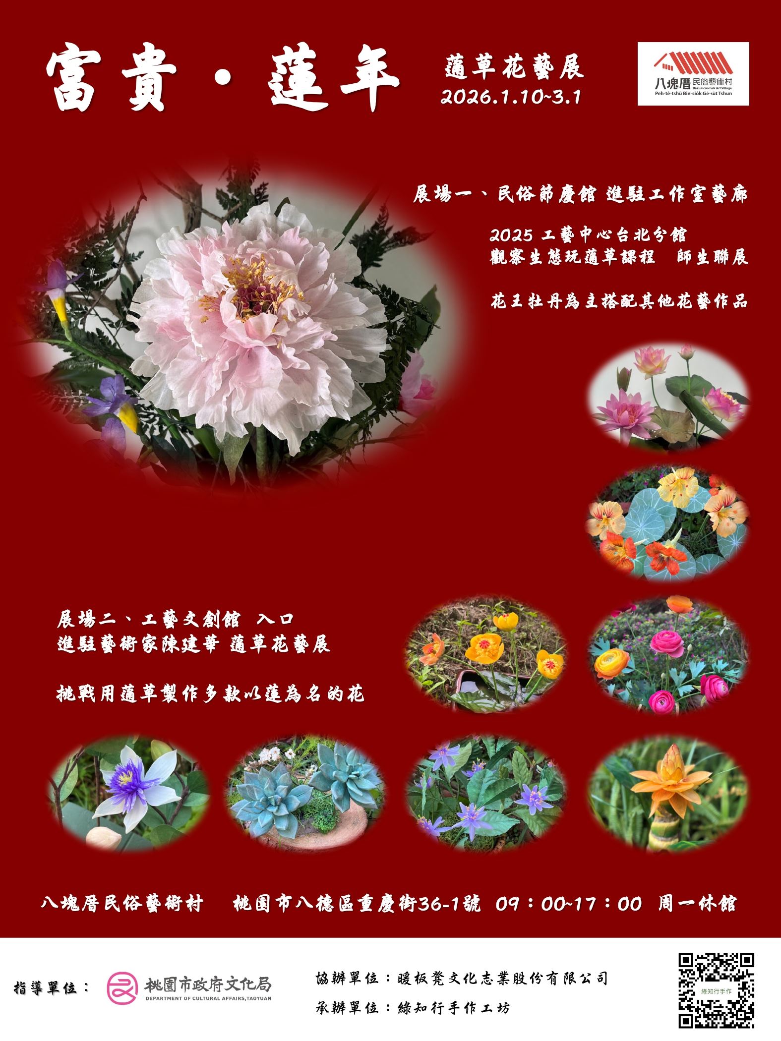 八塊厝民俗藝術村透過藝術家駐村計畫,提供創作與交流的平台,並結合展覽、工作坊與推廣活動,逐步成為桃園傳統工藝保存與培育的重要據點。誠摯邀請市民朋友闔家前來參觀《富貴.蓮年》,在新春時節走進工藝與自然共舞的祝福風景,感受民俗藝術所帶來的溫潤與美好。