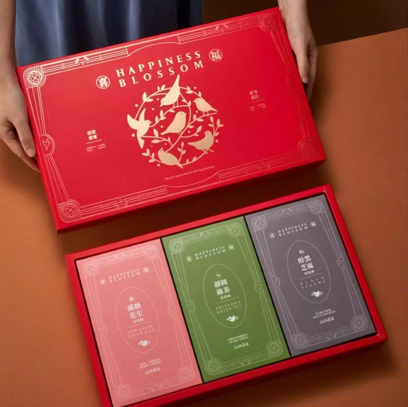 花現喜福新年禮盒系列涵蓋多元產品組合與價格帶,從古早味花生娃娃酥、健康取向的減糖花生、清香的靜岡綠茶,到經典黑芝麻娃娃酥與綜合口味禮盒,滿足不同預算與送禮對象的需求。禮盒設計巧妙融合傳統喜氣元素與現代美學,無論贈送長輩、親友、客戶或員工,都能恰如其分地表達心意。