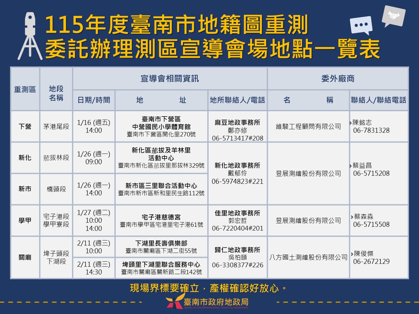 為使重測區內土地所有權人充分瞭解作業內容與權益事項,臺南市政府地政局自115年1月16日起將陸續舉辦5場「115年度臺南市地籍圖重測作業宣導會」,歡迎民眾踴躍參加。