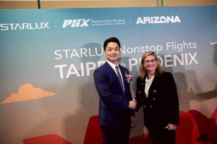 臺北市長蔣萬安今(15)日應邀出席星宇航空「臺北-鳳凰城」直飛首航剪綵儀式,宣告兩市間的空中新航線正式啟動。出席現場的包含星宇航空執行長翟健華、外交部部長林佳龍、交通部常務次長林國顯、桃園國際機場公司董事長楊偉甫等,而鳳凰城市長 Kate Gallego一行人也在參與儀式後、搭乘首航班機返回鳳凰城。