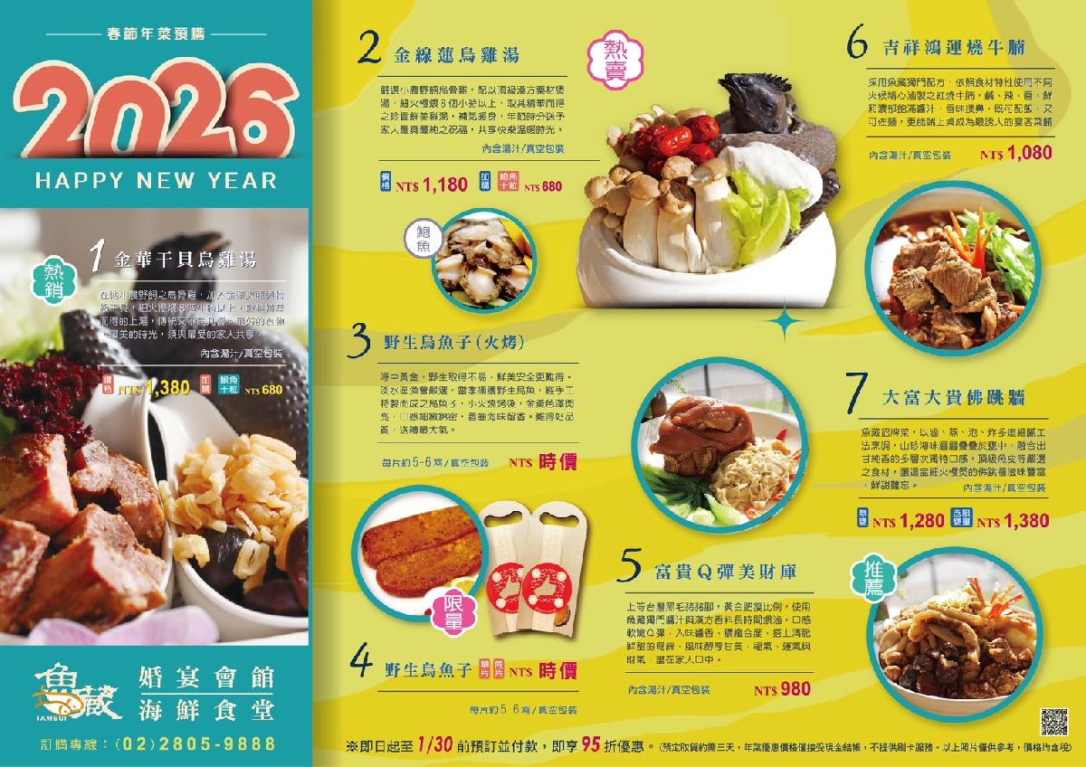 淡水區漁會總幹事吳永寬表示,過年是家人團聚、放鬆心情的美好時刻,為免年菜準備繁瑣,魚藏餐廳特別以「方便、安心、富含年味」為出發點,精心規劃今年的十四道年菜,讓民眾輕鬆享有豐盛佳餚。招牌料理「大富大貴佛跳牆」融合多種珍貴海味與豐富食材,經慢火細燉,呈現層次分明的絕佳風味;「金線蓮烏雞湯」以珍貴金線蓮藥材細火慢熬,湯頭溫潤清香,養生又暖胃;而「金華干貝鮮雞湯」則將干貝鮮甜與雞肉甘醇融合,滋味濃郁回甘。象徵補財庫的「富貴Q彈美財庫」選用國產黑毛豬腿庫,肉質軟嫩、Q彈入味;限量供應的「野生烏魚子」(火烤/原味),香氣濃郁、風味細緻,再配上「吉祥鴻運燒牛腩」、「秘製醬烤豬肋排」、「芙蓉花雕海明蝦」等佳餚,讓年節餐桌在海陸交會中注入滿滿的祝福與儀式感。