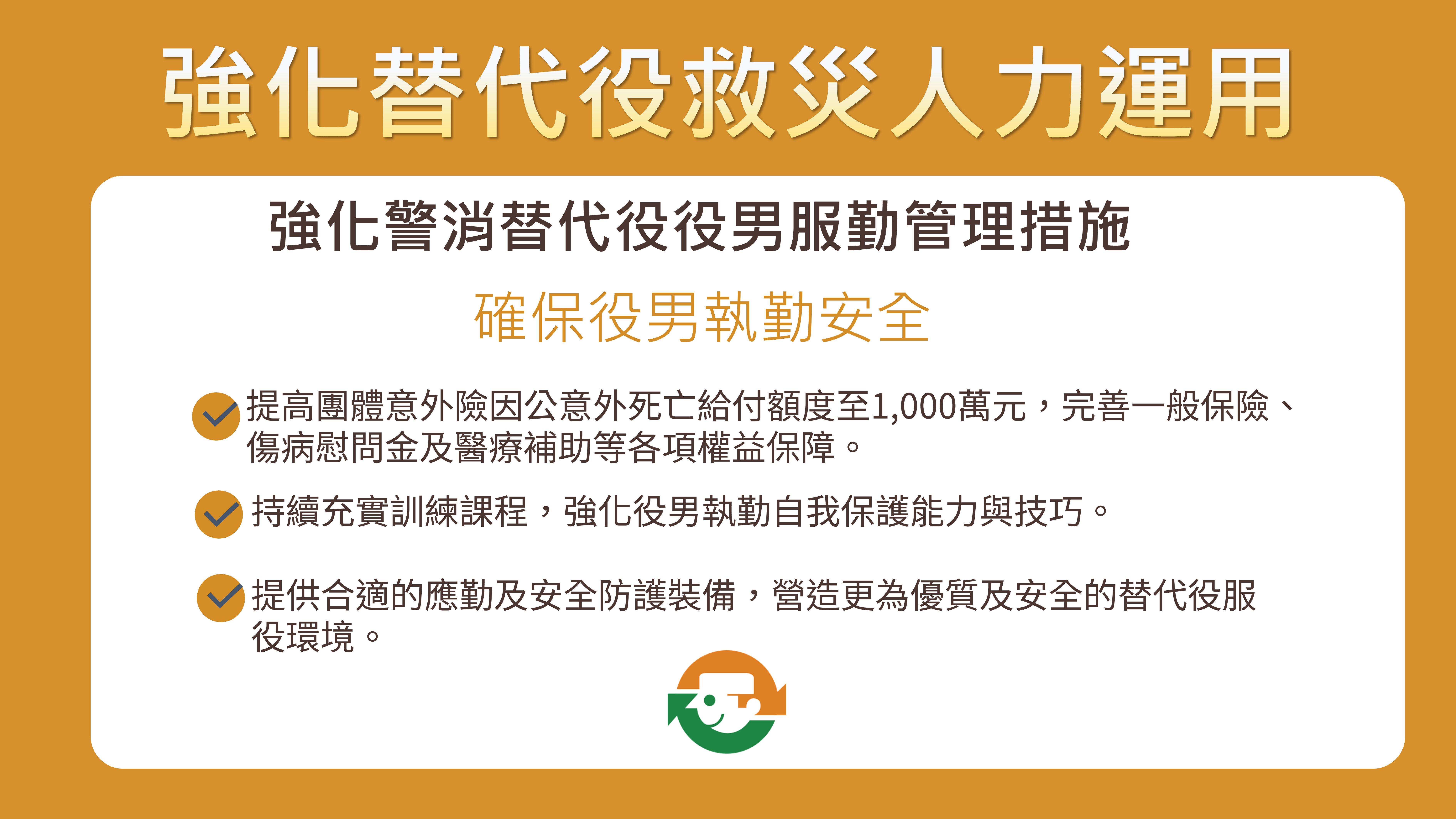 內政部表示,警消替代役役男在分發服勤前,都已經接受完整的基礎和專業訓練,取得EMT-1、防災士和志願服務三證照,具備各項應變勤務的基本執勤能力;役男在服役期間均有團體意外險、一般保險、傷病慰問金及醫療補助等各項權益保障。未來將持續充實訓練課程,強化役男執勤自我保護能力與技巧,並提供完善的應勤及安全防護裝備,營造更為優質及安全的替代役服役環境。