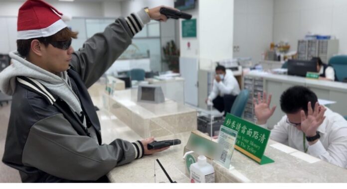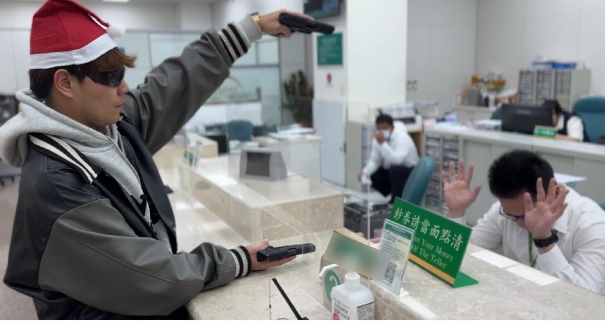 頭戴聖誕帽的黑衣歹徒持槍闖入銀行大聲喝斥,現場氣氛一度緊繃。所幸這並非真實搶案,而是臺北市政府警察局內湖分局日前會同合作金庫商業銀行新湖分行,共同舉行的「金融機構防搶暨攔截圍捕演練」。