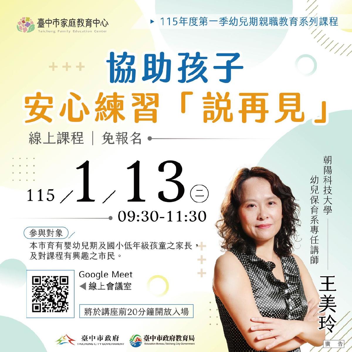 首場線上課程已於1月13日率先登場,邀請朝陽科技大學幼兒保育系專任講師王美玲,聚焦孩子第一次面對分離焦慮時,家長如何以適切方式陪伴孩子安心說再見;專家建議幼兒期課程以建立安全感與情緒穩定為核心,協助家長理解孩子行為背後的情緒需求,並透過日常教養策略,引導孩子逐步累積面對挑戰的勇氣。