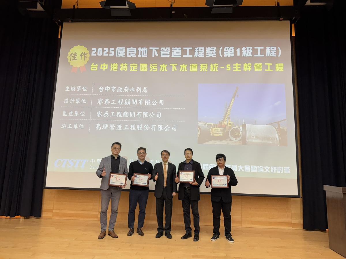 中華民國地下管道技術協會主辦「114年度優良地下管道工程頒獎典禮」於今(16)日在國立台北科技大學集思會議中心盛大舉行,台中市政府水利局以「台中市建成路系統污水下水道分支管網暨用戶接管工程」及「台中港特定區污水下水道系統-S主幹管工程(一)」兩案,分別榮獲工程獎(第一級)優等及佳作殊榮,展現市府在污水下水道工程建設及推動用戶接管上的卓越成果,深獲業界肯定。