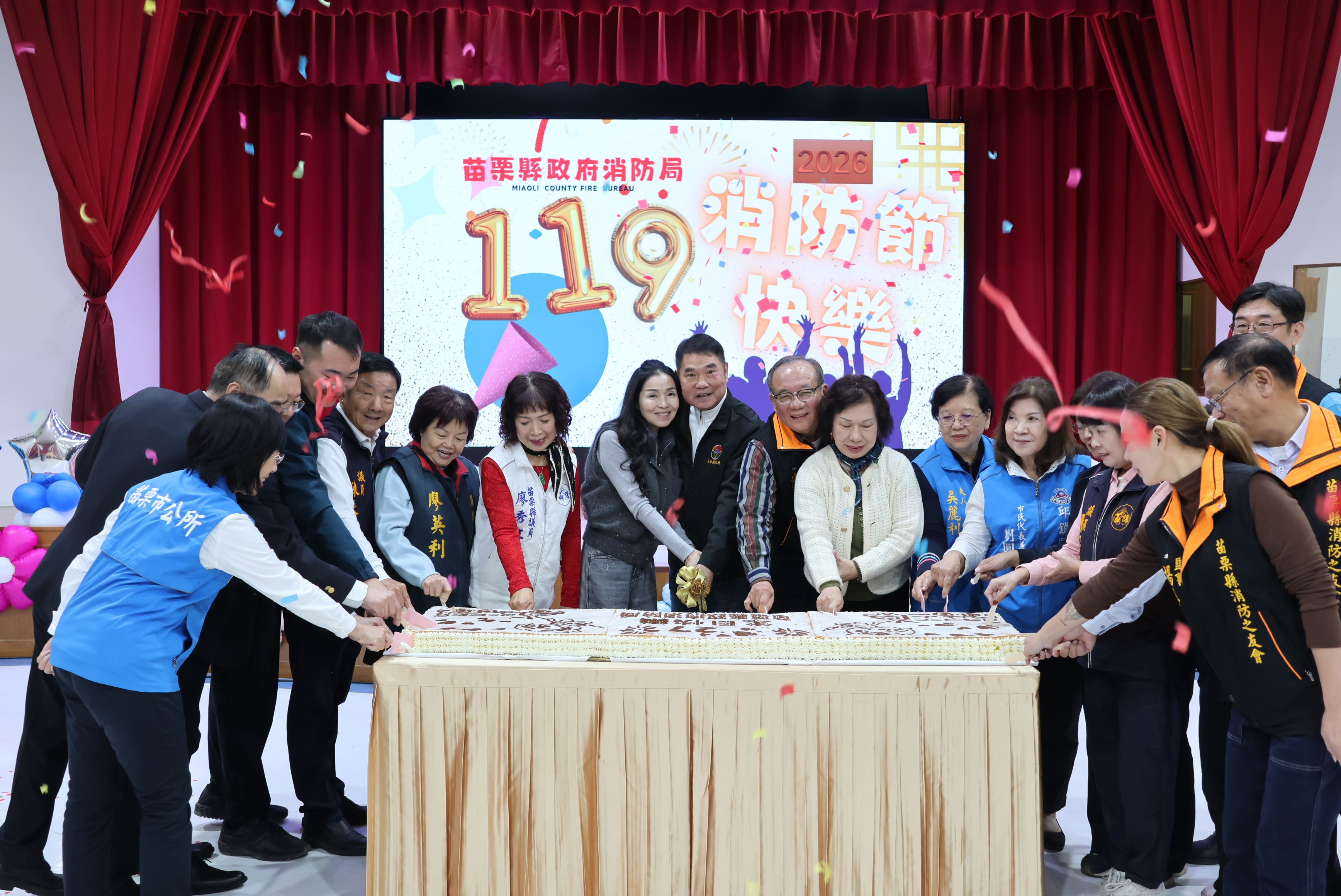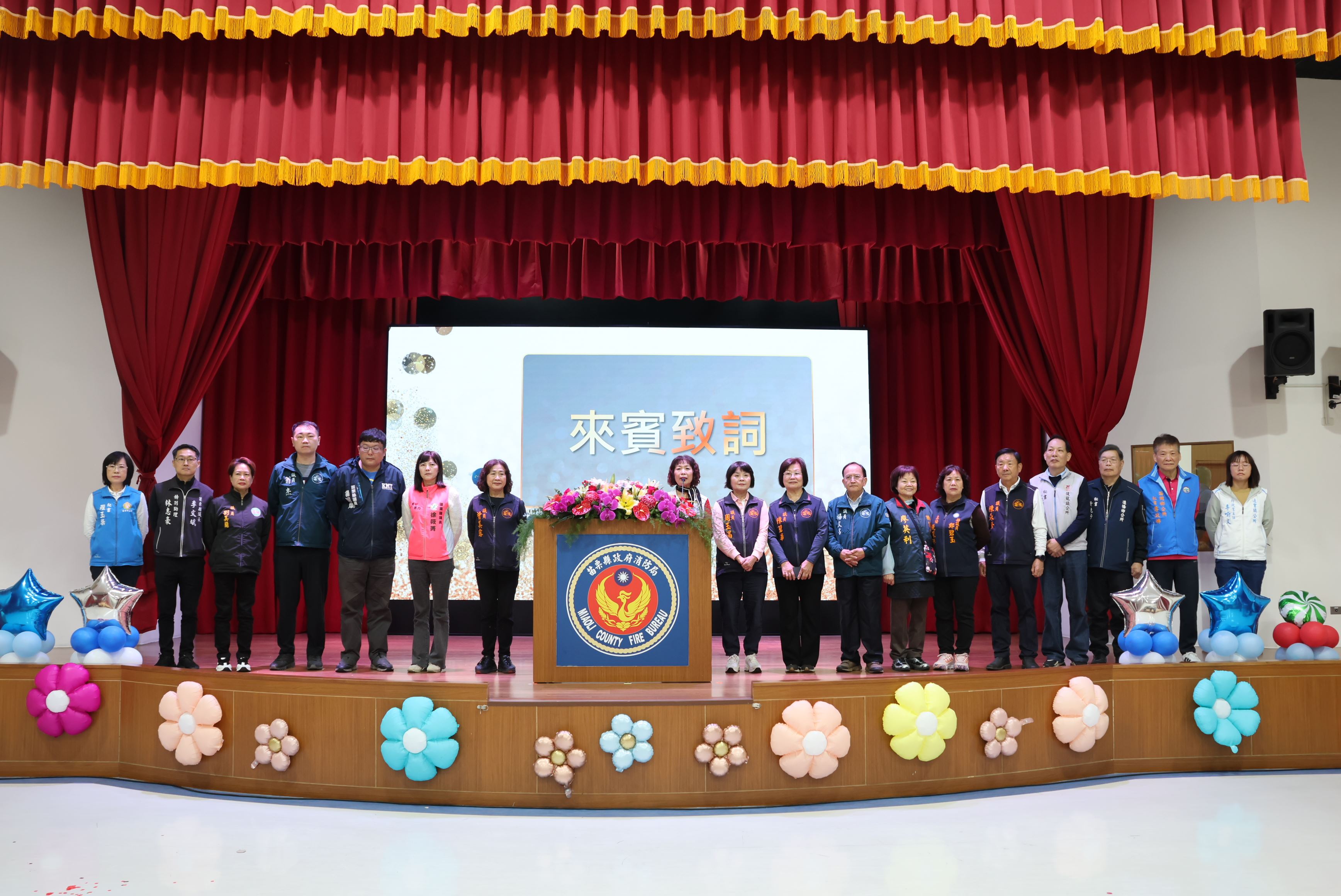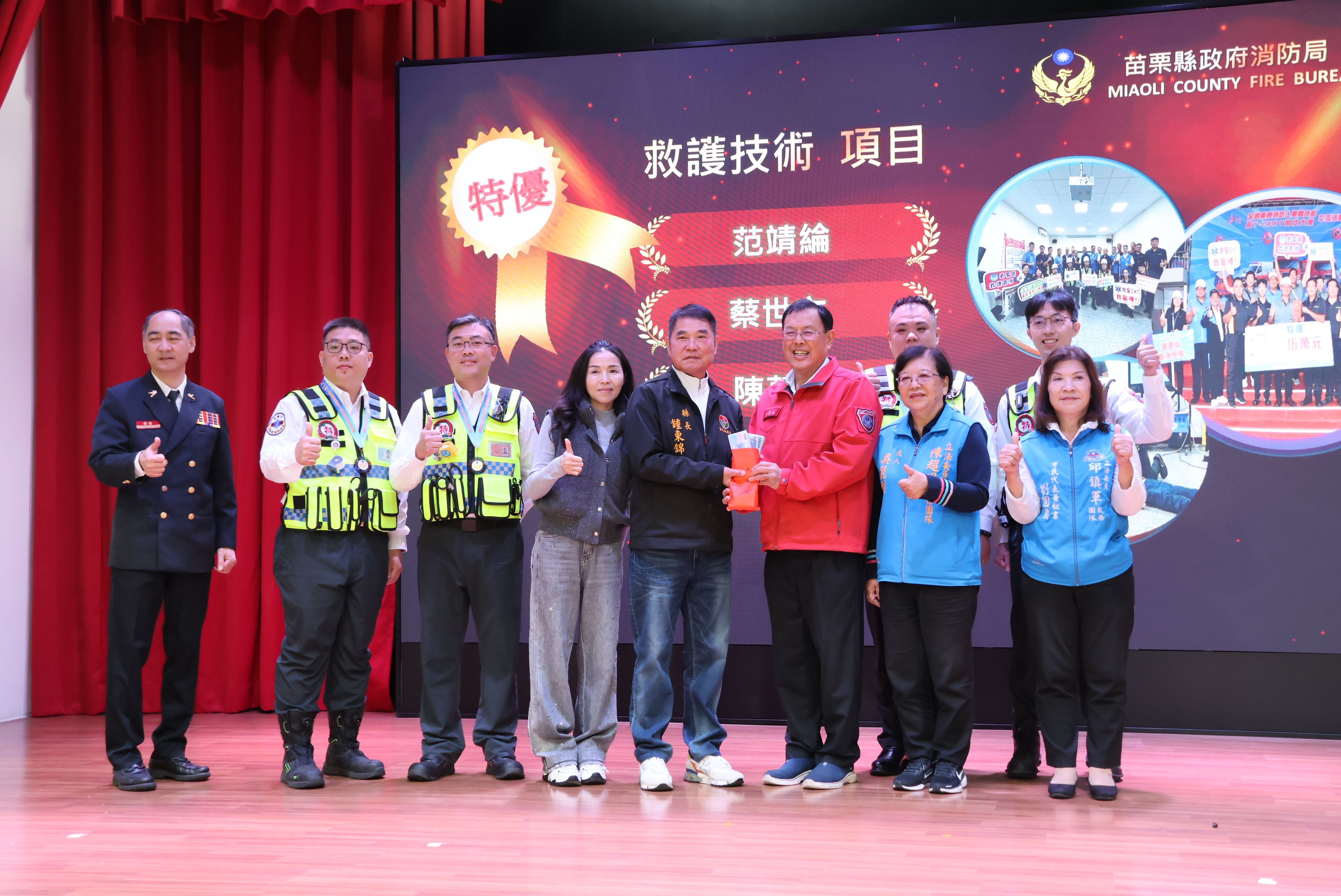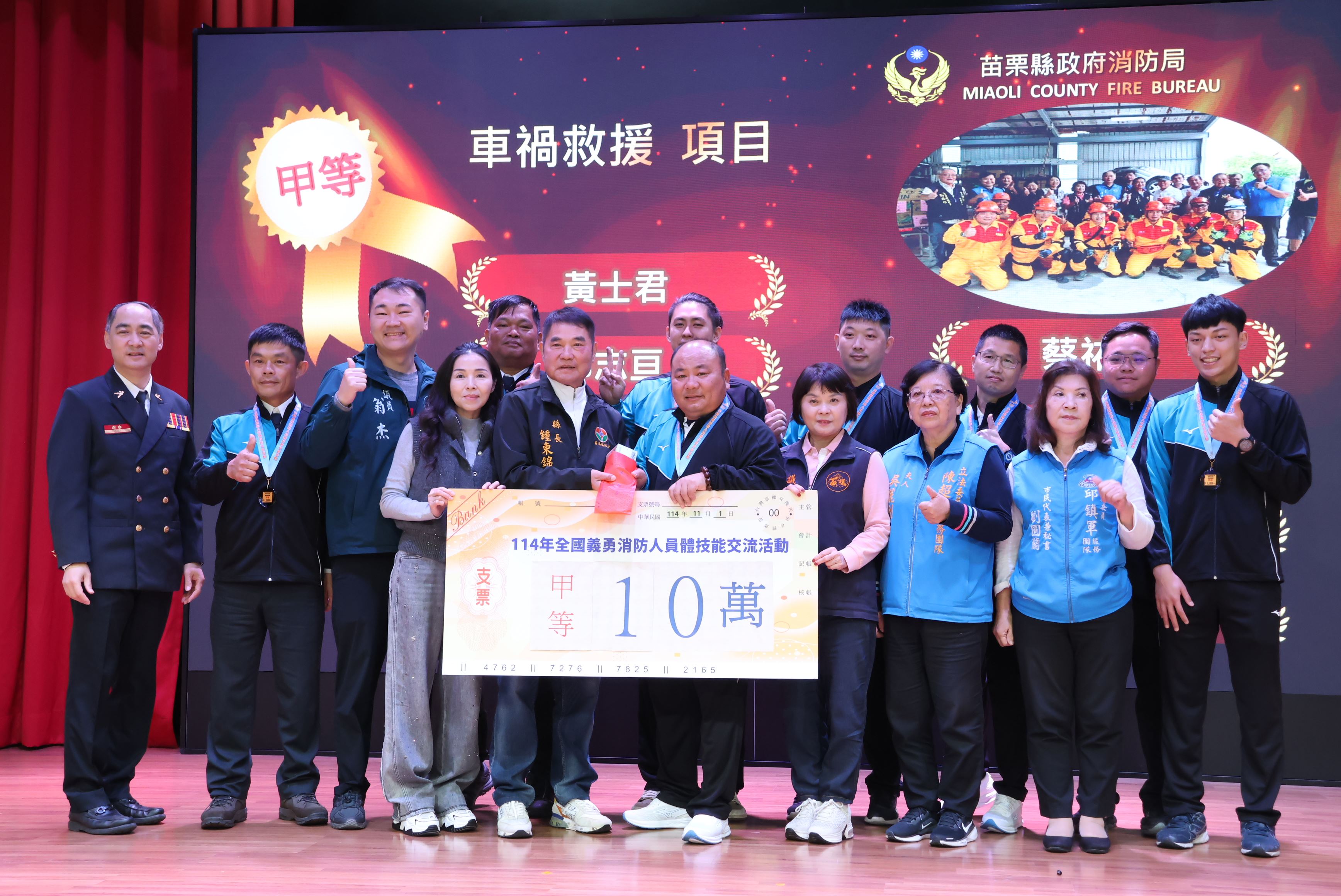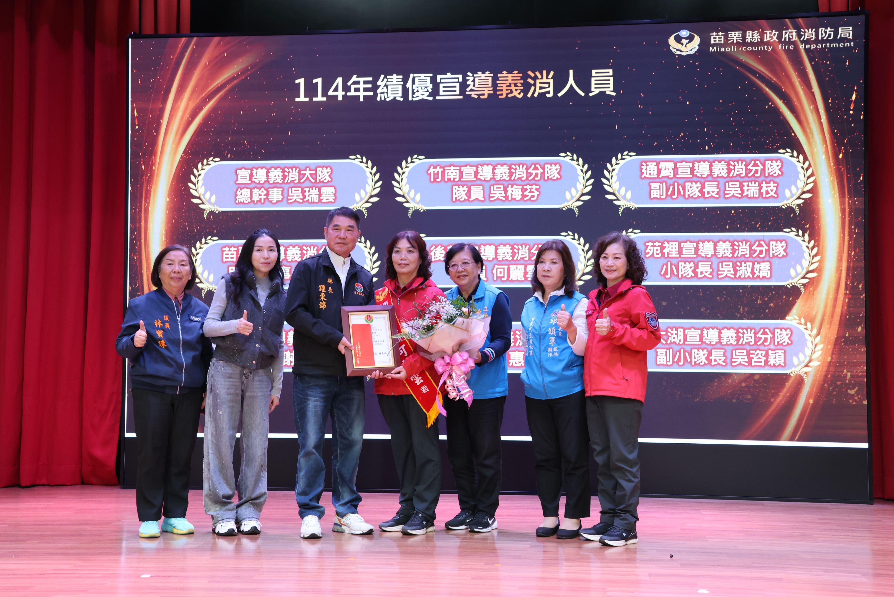縣長鍾東錦偕同夫人陳美琦向所有警義消兄弟姊妹致上最誠摯的感謝,並頒獎表揚20、30、35年資深義消人員獎項,以及年度績優消防、義消、宣導、救護與救難人員獎章,各選區議員、鄉鎮市長等人也到場恭賀,肯定他們在守護縣民生命財產安全上的付出與堅持。