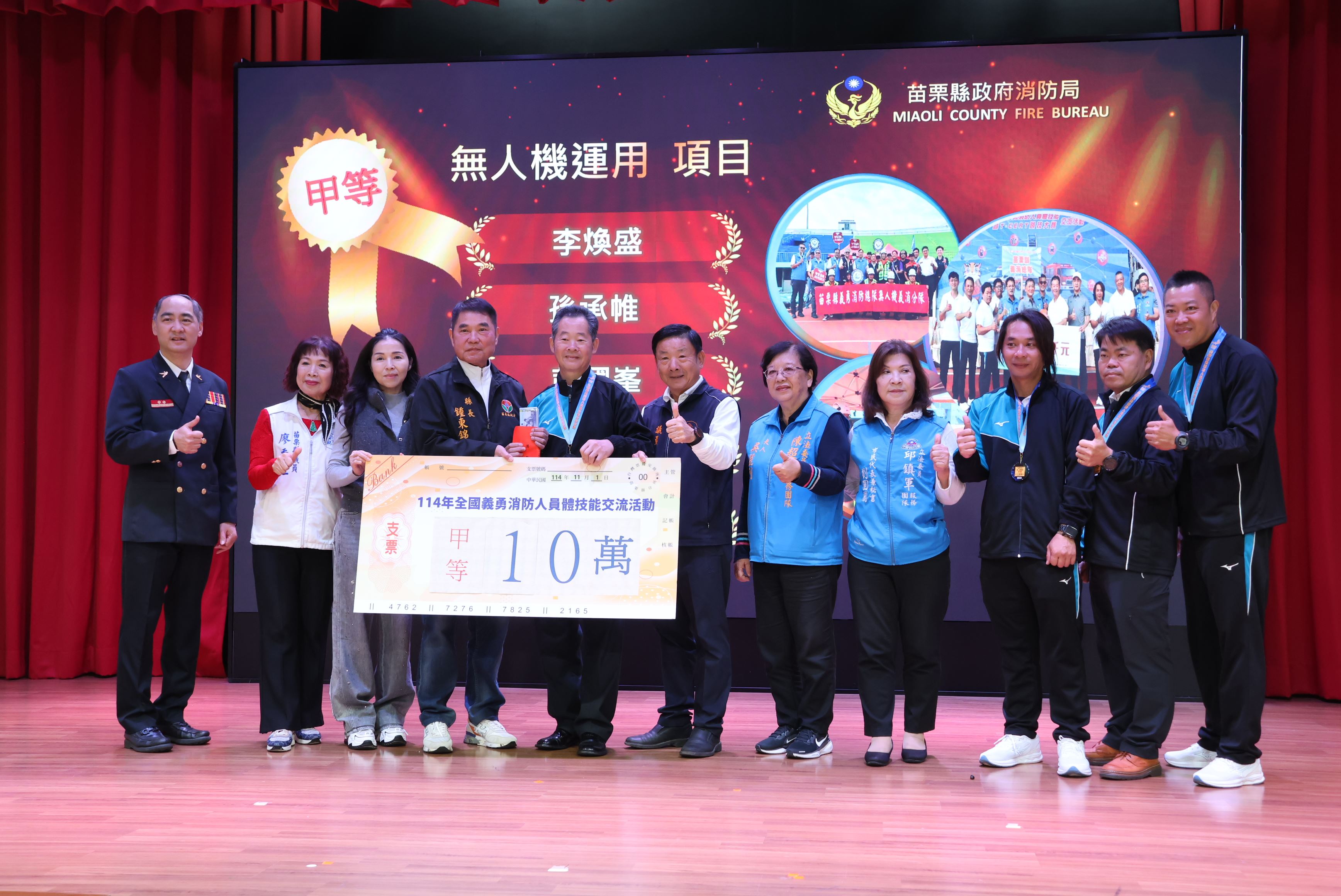 消防局說明,114 年主辦的「全國義勇消防人員體技能交流活動」超過 1,700 名選手與警(義)消同仁共襄盛舉,苗栗縣代表隊在交流競賽中全力以赴,展現多年訓練成果,分別榮獲「救護技術」項目特優(全國第一)、「火災搶救」優等,以及「車禍救援」、「繩索救援」與「無人機操作」三項甲等的亮眼成績。