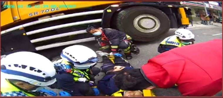 現場為大型吊臂車連續衝撞路邊停放的4輛自小客車、7輛機車,並波及1名行人,行人被撞後受困在大吊車下,造成多處擦挫傷,救護人員先接近安撫患者情緒,給予清洗傷口包扎止血、頸圈及長背板固定,將其送往大千醫院救治。