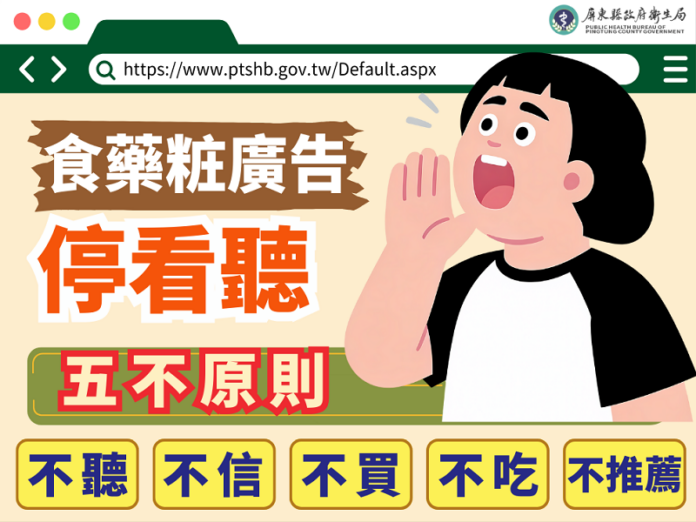 衛生局呼籲,凡是廣告內容太神奇、太吸引人的,都需要提高警覺,並堅持五不原則:不信、不聽、不買、不吃、不推薦,勿信誇大不實之食品、藥物及化粧品廣告,以免健康權益受損,另建議民眾可至食品藥物管理署「違規食品、藥物、化粧品廣告民眾查詢系統」(網址:http://pmds.fda.gov.tw/illegalad/)、「食藥膨風廣告專區」(網址:http://www.fda.gov.tw/TC/news.aspx?cid=5085)查詢廣告相關資訊,做為選購產品之參考。